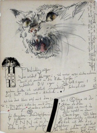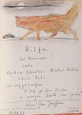Hemos encontrado un dibujo de un gato rubio acompañado del siguiente texto: “¡Socorro, señores! ¡Gente! Félix, el gato de Kerstin Schlüter, se ha perdido. Atiende al nombre de Feli. 500 para la persona que lo encuentre. Y agradecimiento eterno. Vuestro Janssen”. Más abajo está el teléfono de la Sra. Schlüter y el del propio Janssen.