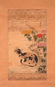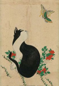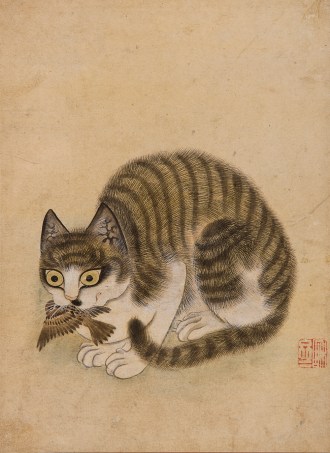 Hemos encontrado tres cuadros suyos con gatos. En uno de ellos hay una madre gata con su camada, una escena que no se repite en ningún otro de los cuadros minwha.