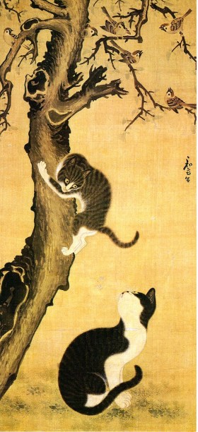 El gato que trepa por el tronco del árbol mira al que se ha quedado en el suelo como si se comunicaran. El artista usó un pincel muy fino para pintar a los dos gatos y a los gorriones, mientras que el tronco del árbol está hecho con trazos más gruesos, más fuertes.