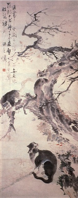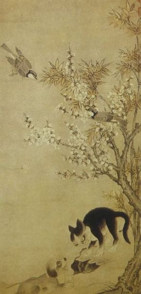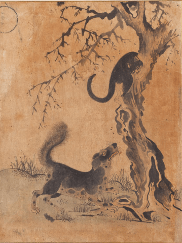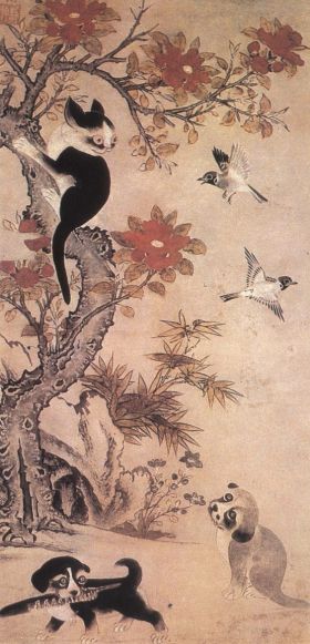 En uno de los dos cuadros que hemos encontrado, el gato trepa por el tronco de un árbol mirando hacia abajo, aunque los dos perros que están en el suelo no parecen tener malas intenciones. En el otro, el gato se enfrenta al perro. En ambos, el gato es blanco y negro con ojos saltones. Ninguno de los gatos de otros cuadros de estilo minwha tienen ojos parecidos. Al contrario, son animales muy realistas.