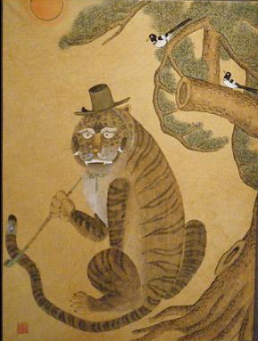 Abundan las pinturas de tigres con aves. Una de las explicaciones es que el tigre simbolizaba el poder, la autoridad, la aristocracia, y la urraca, al pueblo llano. Siempre parece que la urraca u otro pájaro estén a punto de hostigar al pobre felino al que llamaban “tigre idiota”, en una clara alusión sátira de las diferencias sociales.