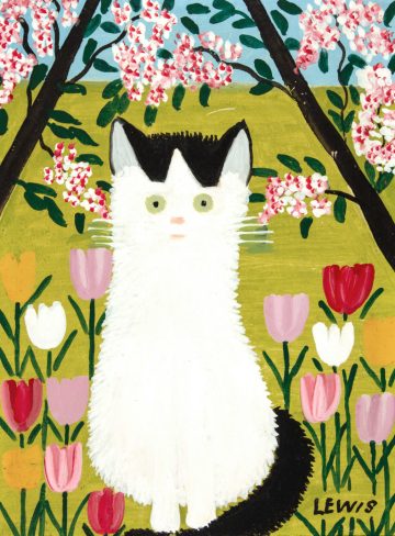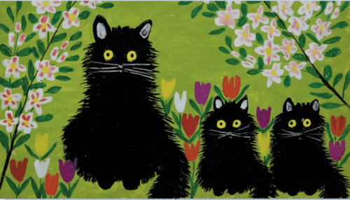 A primera vista, muchos de sus cuadros parecen idénticos, pero basta con fijarse un poco para ver que cada uno tiene algo diferente. La expresión de los gatos nunca es la misma, están debajo de árboles diferentes, las mariposas no son iguales… Siempre hay un pequeño cambio. Las variaciones sobre gatos son muy numerosas.