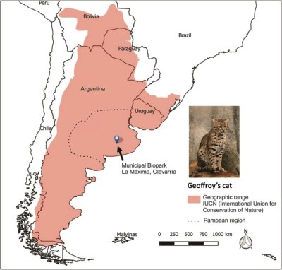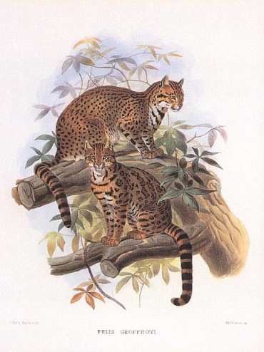 Una peculiaridad del gato de Geoffroy es que se yergue sobre las patas traseras para otear a su alrededor mientras se apoya en la cola. También son buenos nadadores y se atreven con ríos de hasta treinta metros de ancho. Se encuentra sobre todo en Argentina, el sur de Chile, los Andes del sur de Bolivia, Paraguay y Uruguay en un hábitat bastante variado, desde los humedales de la Pampa hasta las zonas más áridas de matorrales del Chaco, pasando por bosques y áreas montañosas donde se le ha avistado a 3.500 metros de altura.