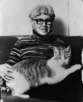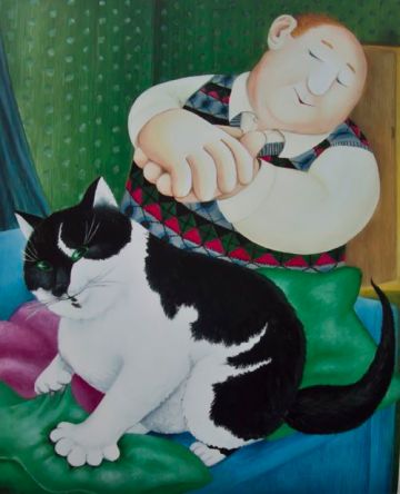 Tenemos la impresión de que algunos de los cuadros reproducidos aquí son retratos de su marido e incluso de ella misma en casa, en el jardín, y de los gatos con los que convivieron. Si comparamos a la mujer de “Alimentando tortugas con gato siamés” con la foto de Beryl Cook, el parecido salta a la vista, aunque el gato no sea igual.