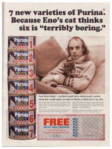 No es ninguna noticia que a Brian Eno le gustan los gatos. Hay una foto suya en blanco y negro, con un gato blanco colgado de su hombro y apoyado en su brazo. Ambos miran a la cámara. Es una curiosa composición delante de una caravana y el músico es muy joven. Nos atrevemos a decir que es anterior a la fundación de Roxy Music.