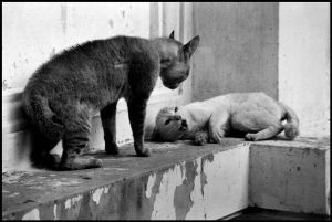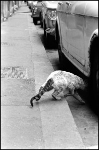 Y esas fotos, las que hacía y hace en cualquier momento, reflejan un profundo sentido del humor cuando se trata de personas, y una gran sensibilidad con los animales. Hay una que nos conmueve particularmente, realizada en 1955 desde un primer o segundo piso enfocando a una calle que bordea el Panteón de Roma, con una mujer alimentando a unos seis gatos. La hierba crece entre los adoquines.