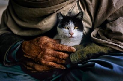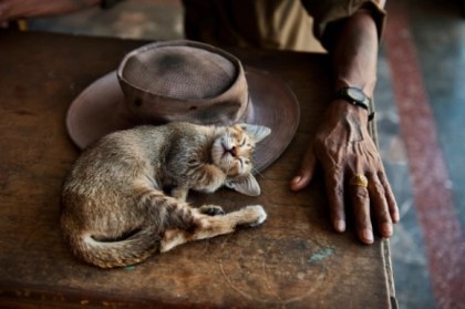 Una de sus fotografías predilectas fue hecha en un monasterio budista de Tailandia. Un pequeño gato aguarda con suma paciencia a que el monje acabe sus deberes espirituales. Steve McCurry desea que, algún día, veamos a los animales como seres inteligentes que merecen todo nuestro respeto y afecto. “En la mayoría de casos, la supervivencia y bienestar de los animales domésticos dependen totalmente de nosotros”, dice. “Es nuestro deber protegerlos como a nuestros hijos. Creamos vínculos con los animales, por eso espero que acabemos tratándolos con el cuidado que se merecen”.