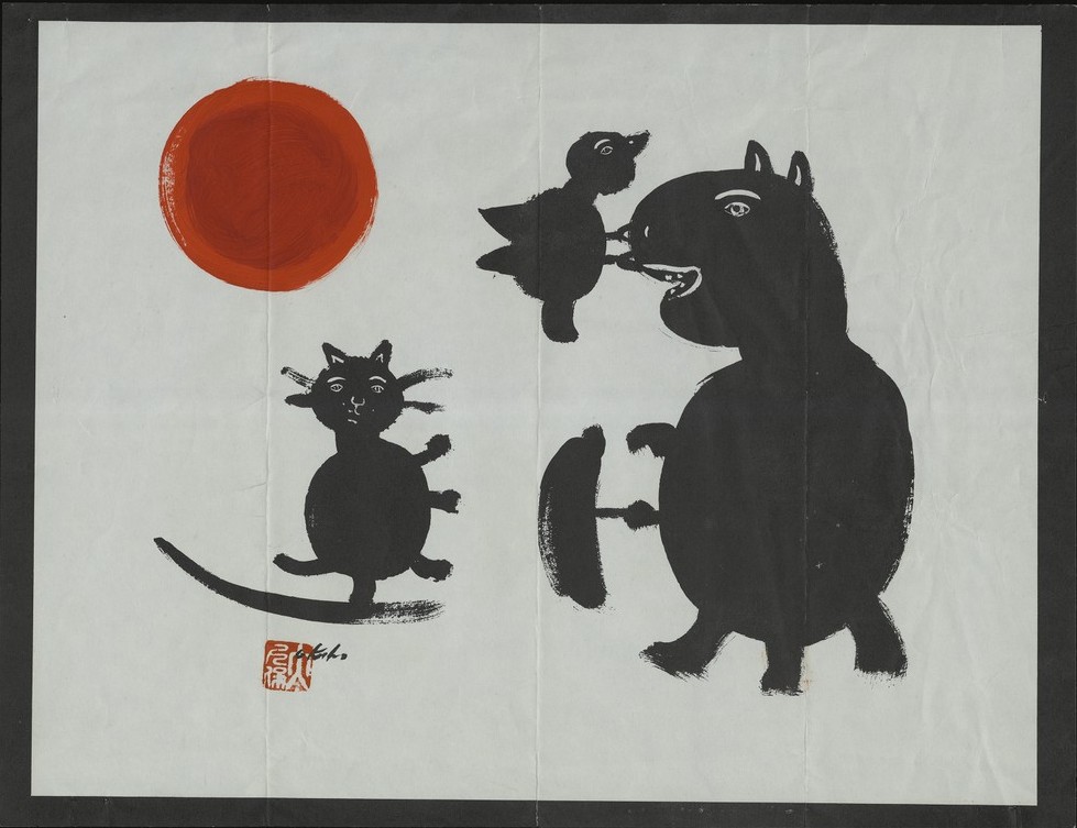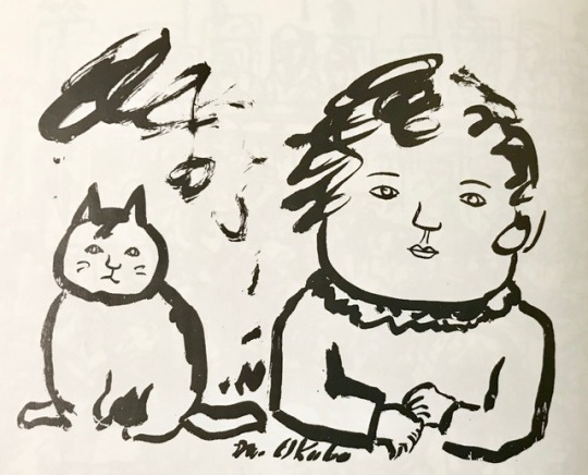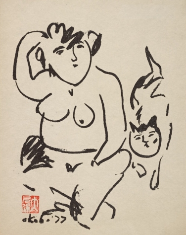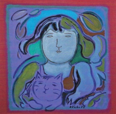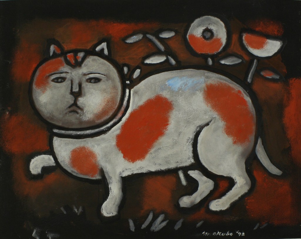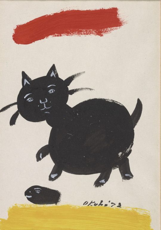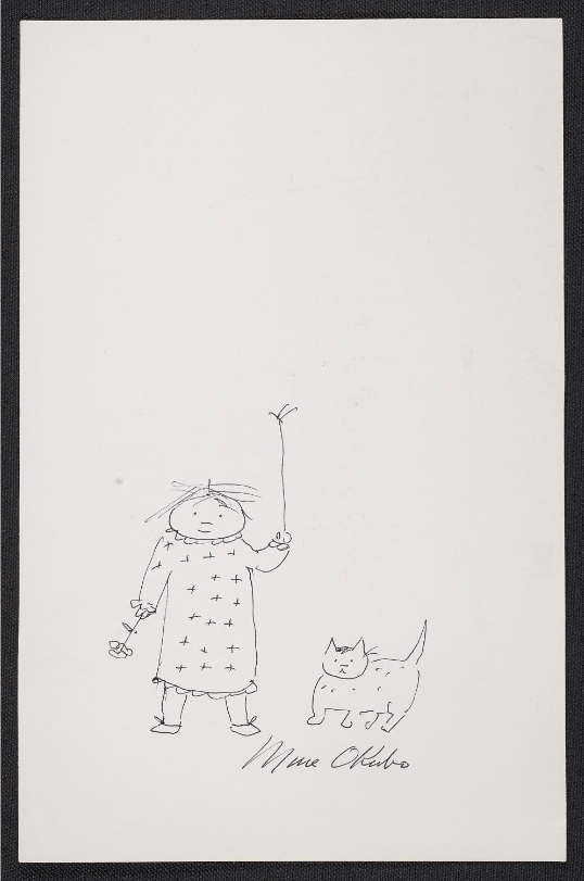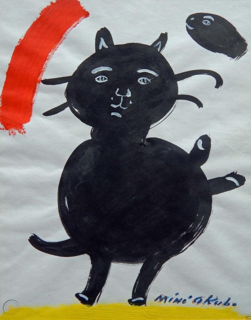 Miyo falleció en 1940, y un año después Miné pintó “Miyo y gato”, en el que se la ve sentada en el banco de un parque con un libro en el regazo (¿la Biblia?) y un gato a su lado. Los gatos fueron un tema recurrente en su pintura y siempre que firmaba un autógrafo añadía el pequeño dibujo de uno. Incluso hemos leído que en algún momento de su vida fue “canguro” de gatos en Nueva York, pero no hemos podido comprobar la veracidad de la información.