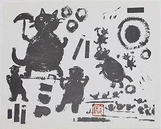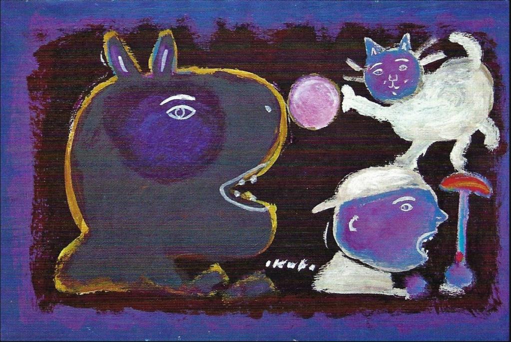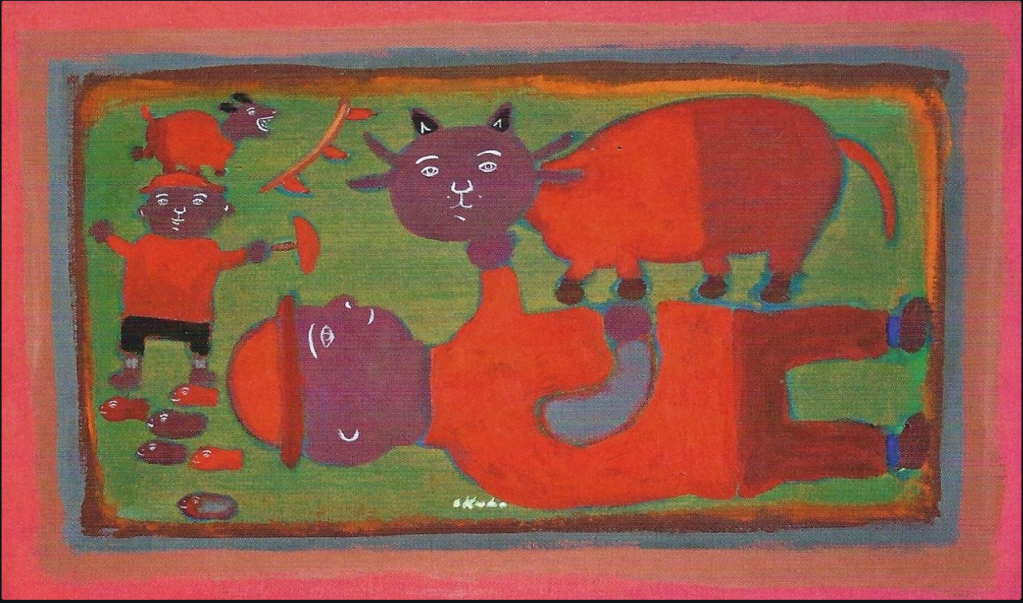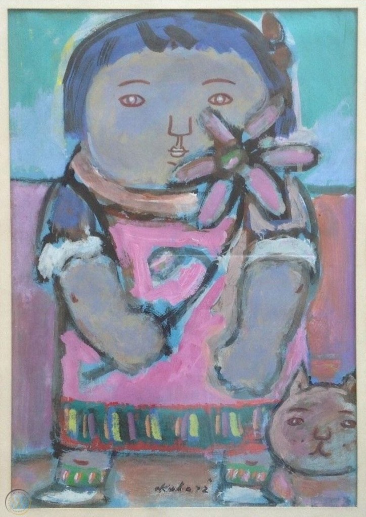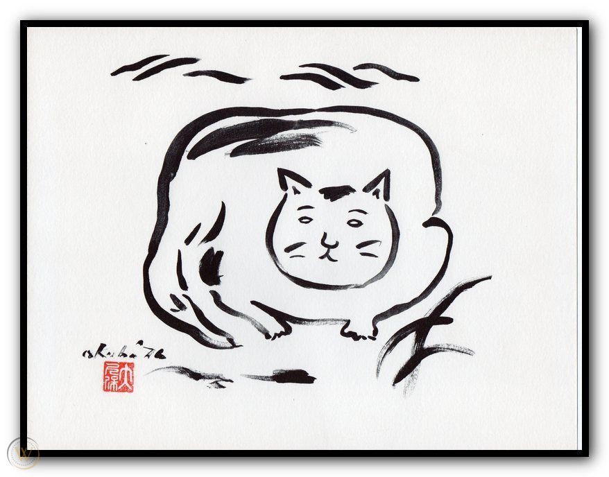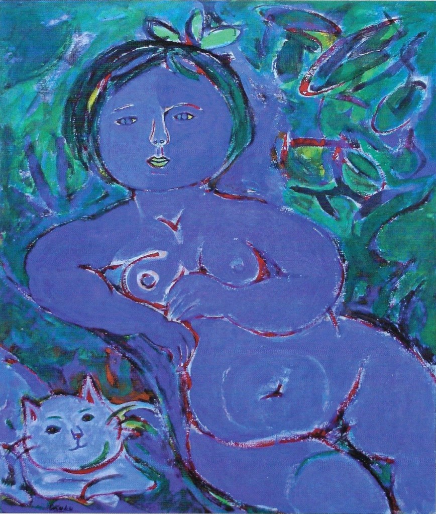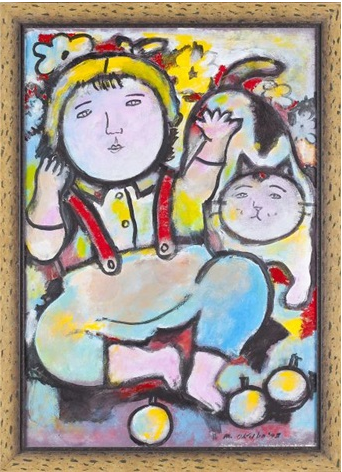 Miyo falleció en 1940, y un año después Miné pintó “Miyo y gato”, en el que se la ve sentada en el banco de un parque con un libro en el regazo (¿la Biblia?) y un gato a su lado. Los gatos fueron un tema recurrente en su pintura y siempre que firmaba un autógrafo añadía el pequeño dibujo de uno. Incluso hemos leído que en algún momento de su vida fue “canguro” de gatos en Nueva York, pero no hemos podido comprobar la veracidad de la información.