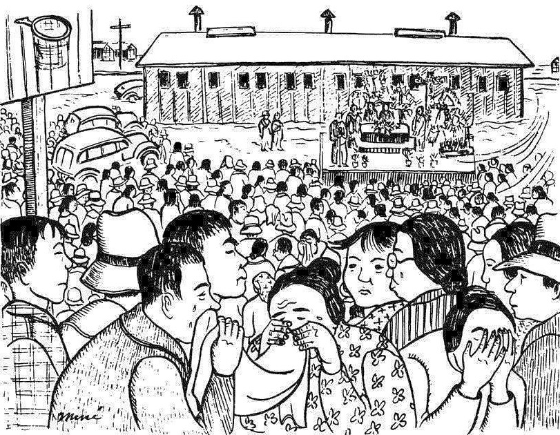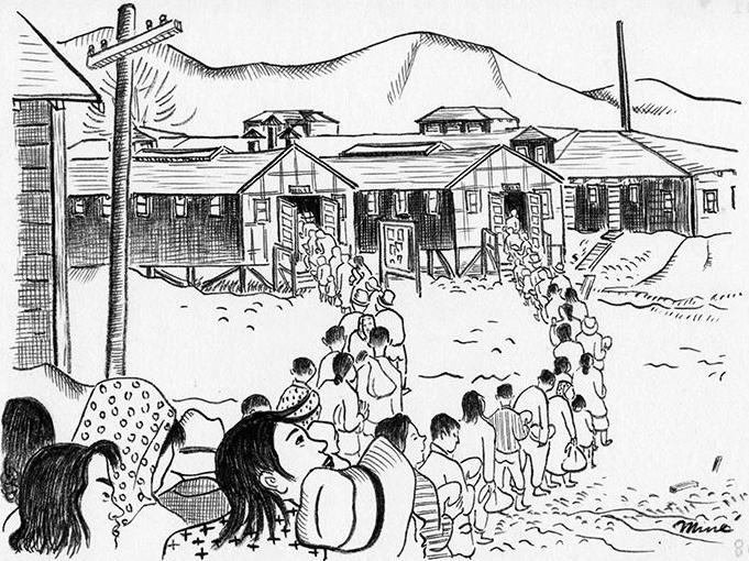 Miné y uno de sus hermanos acabaron en el centro de “reubicación” de Tanforan, un antiguo hipódromo en San Bruno, California, donde compartían un box de 6 por 3 metros que aún olía a estiércol y dormían en sacos de heno. Posteriormente fueron trasladados al campo de detención de Topaz, en Utah.