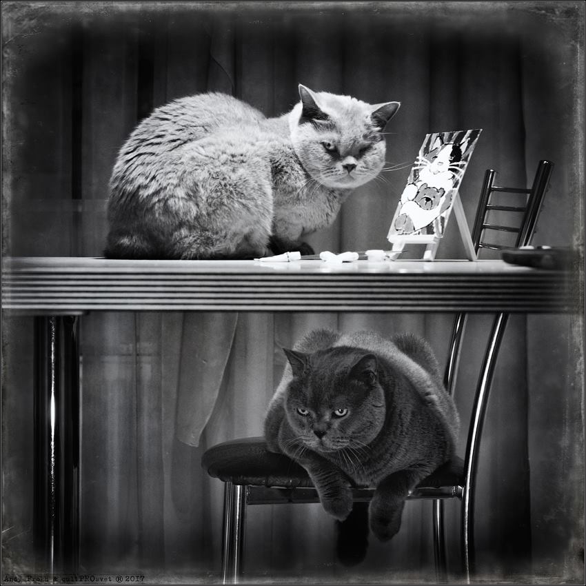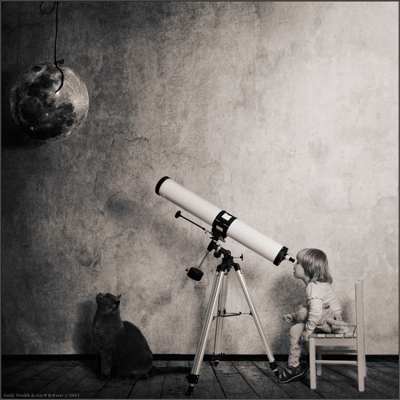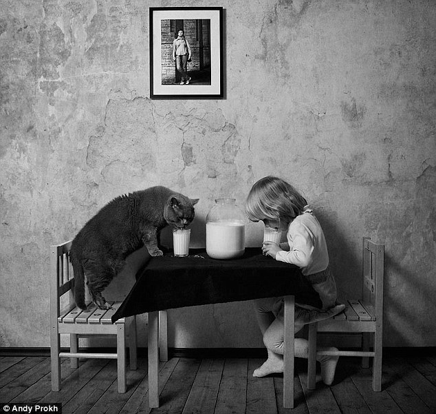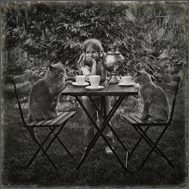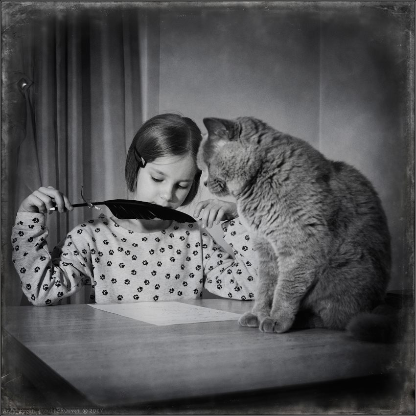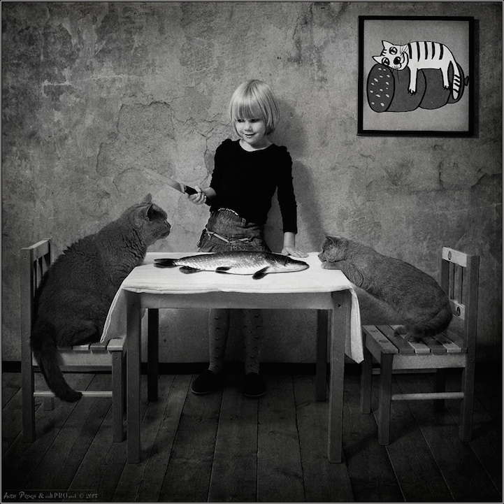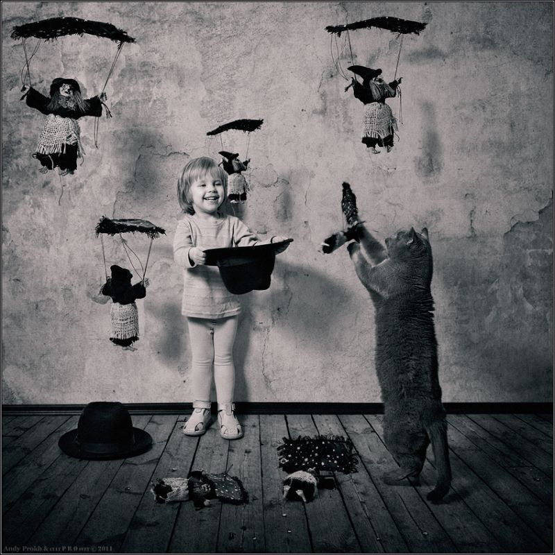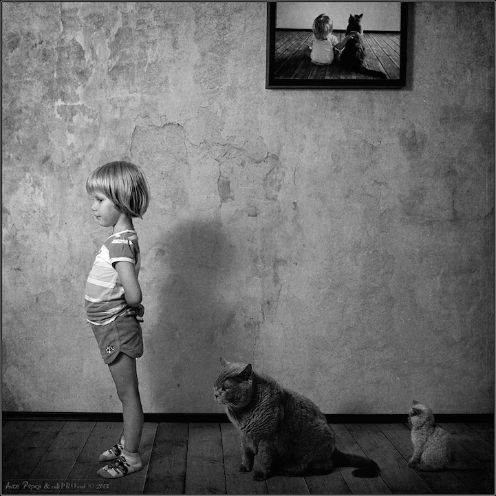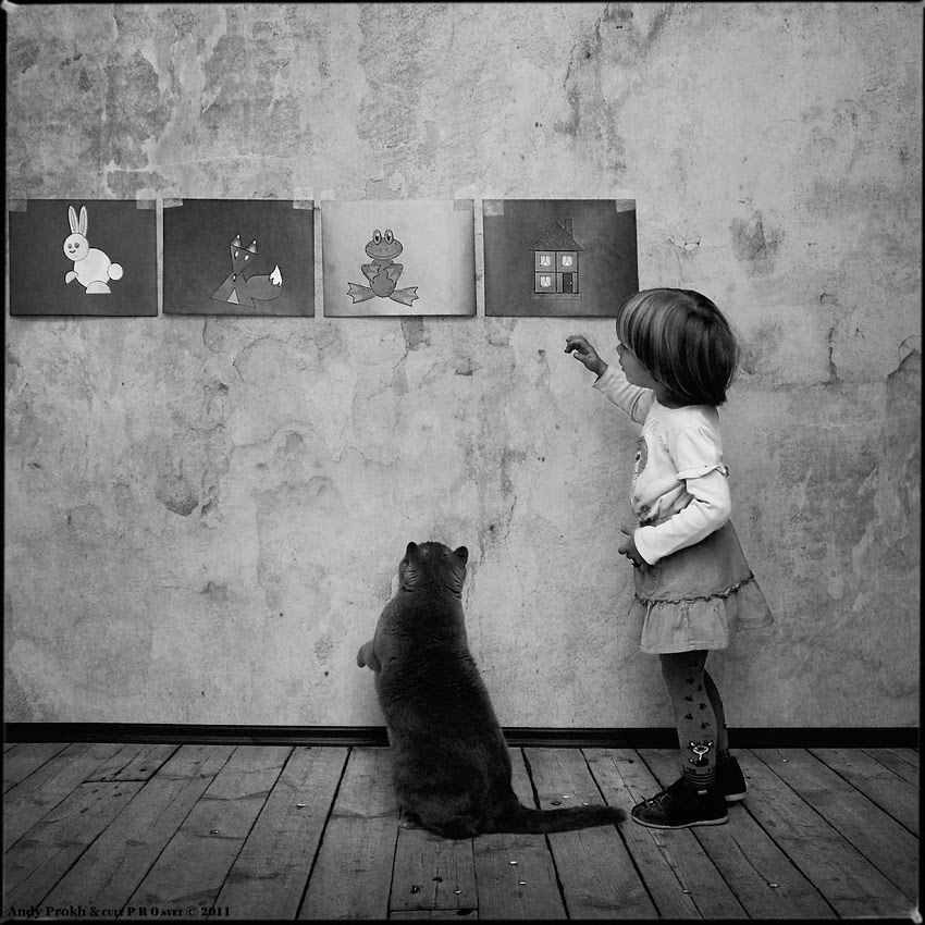 Cuando habla de sus dos modelos, se refiere a su hija Katherine y a la gata Lilu Blue; en otras palabras, a Kat y a Cat. Empezó a fotografiarlas cuando Kat apenas tendría un año, como se ve en la foto “Curiosidad y prudencia”.