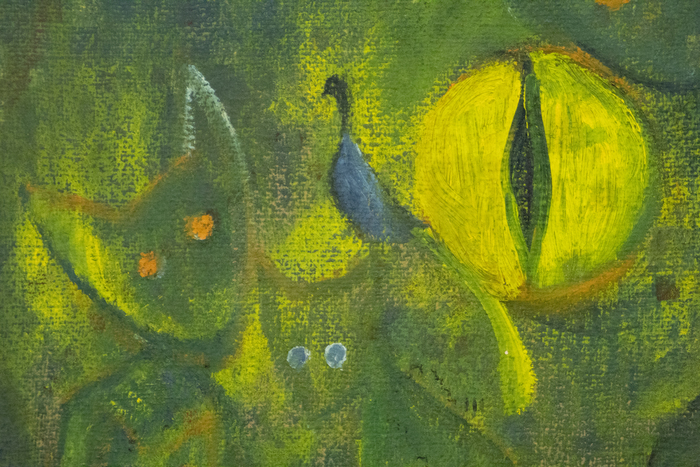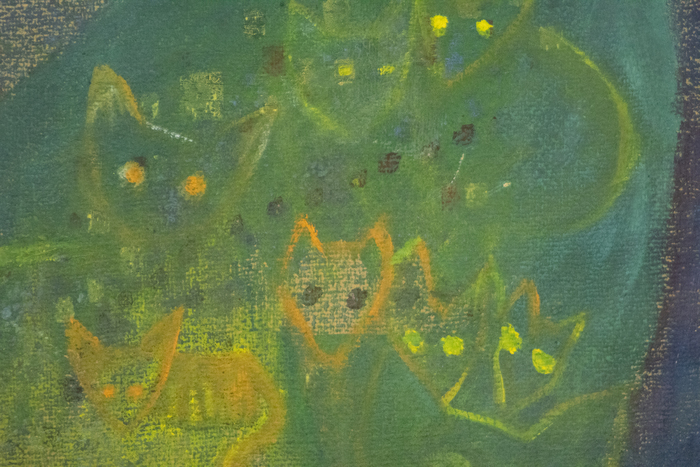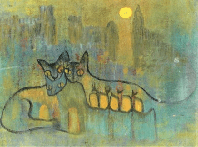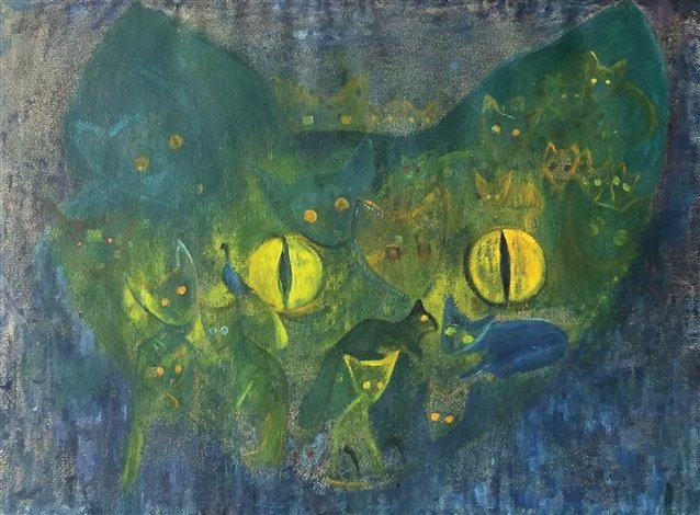 La periodista Teresa del Conde cuenta cómo fue a visitarla en varias ocasiones “rodeada de sus gatos” en su casa de la colonia de Tlacopac. Quizá porque tenía muchos, en sus cuadros hay más de los que se ven a primera vista. Debemos fijarnos un poco para descubrirlos a todos, como ocurre en “A la medianoche, México”.
