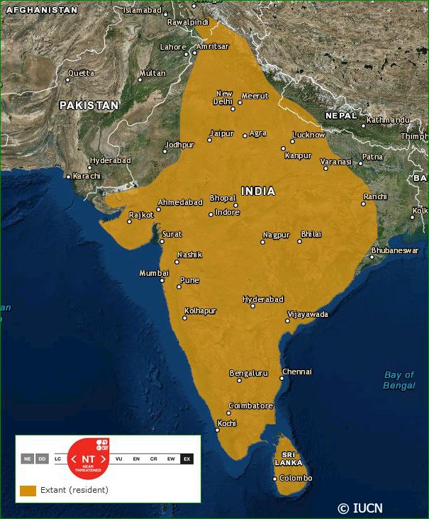 Aunque es endémico de los bosques secos de hoja caduca de India, Sri Lanka y Nepal, la población en India está muy fragmentada debido a la intensa irrigación para la agricultura, con el consiguiente impacto negativo en su principal hábitat.