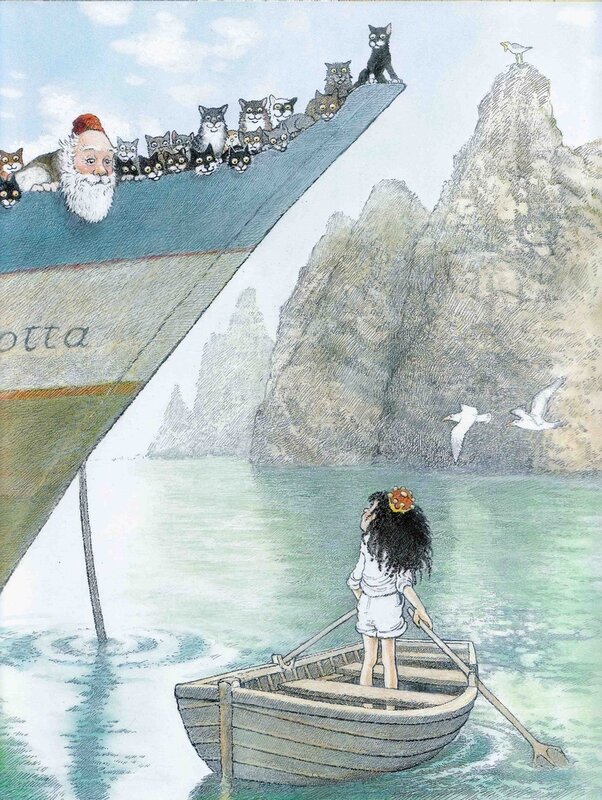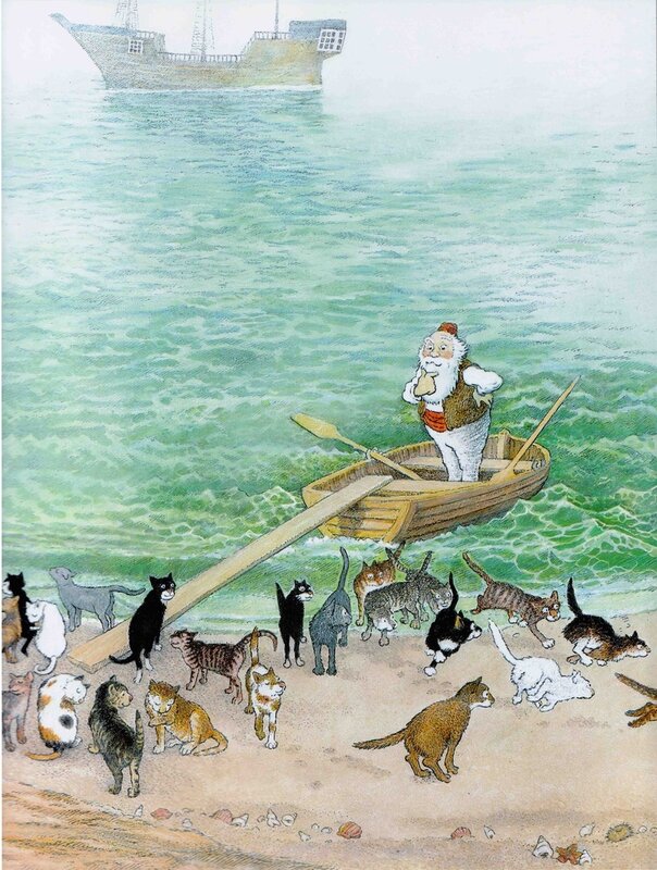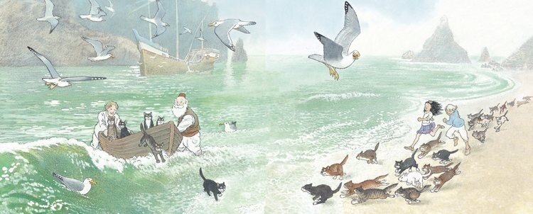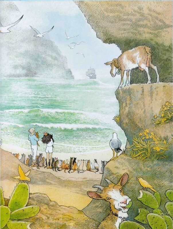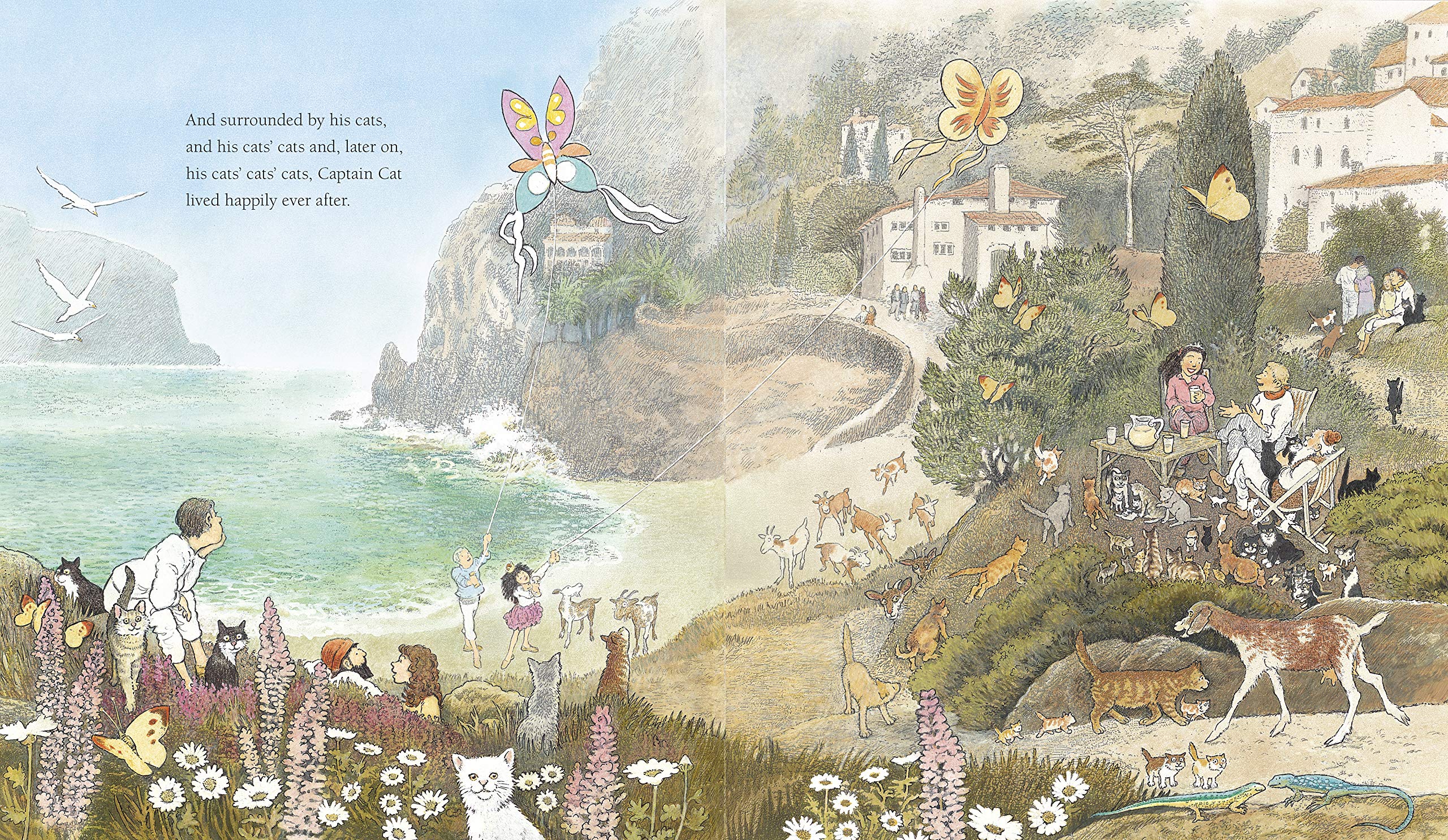 Puso rumbo a la isla. En cuanto avistaron el barco, la reina, el primer ministro y los gatos, locos de alegría, se precipitaron a su encuentro. El cuento acaba así: “Rodeado de sus gatos, de los gatos de sus gatos, y posteriormente de los gatos de los gatos de sus gatos, el Capitán Gato fue feliz para siempre”.
