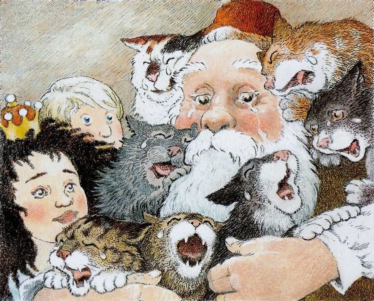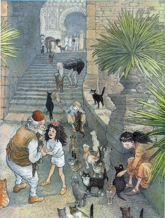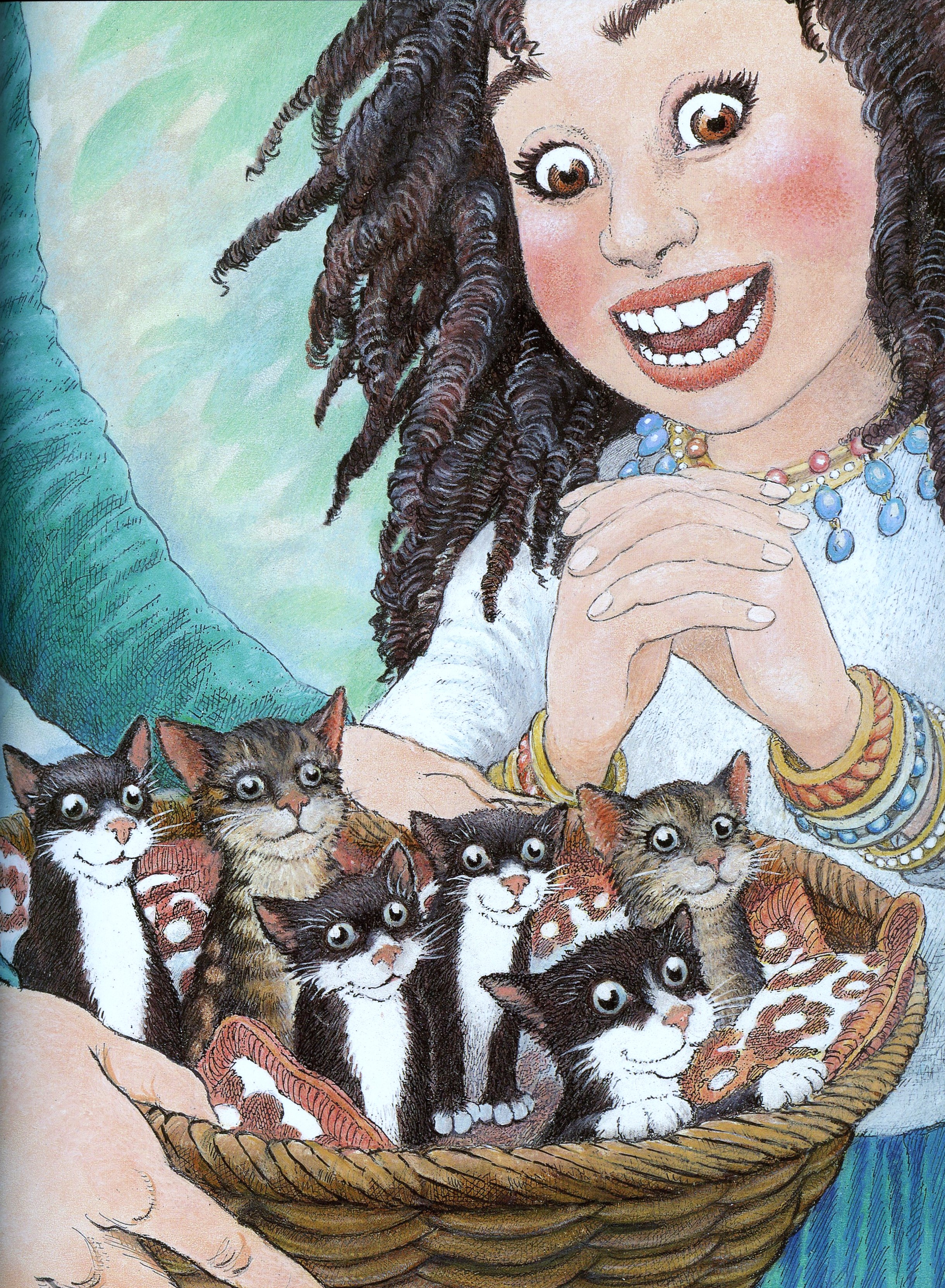 La joven no sabía cómo agradecerles tantos regalos y quiso darles lo mejor que tenía. Al cabo de unas semanas de espera (durante las que los mercaderes se frotaban las manos imaginando diamantes, rubíes y otras maravillas), la reina apareció con lo mejor que podía ofrecerles la isla, algo mucho más valioso que todas las piedras preciosas, ¡seis gatitos! Uno para cada mercader.