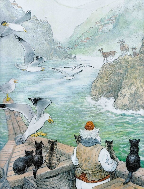 Los pobres mercaderes tuvieron un enorme disgusto y al llegar a puerto, dieron los seis gatos al Capitán Gato. Este, con los gatos de sus gatos, volvió a tener ganas de surcar los mares y recorrió los lugares soñados. Pero ninguno le gustaba tanto como la lejana isla, donde había quedado su corazón.