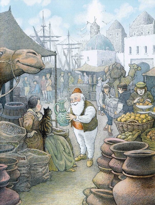 Pero sin gatos, los nuevos mundos perdieron su atractivo. Regresó al puerto habitual y descargó sus tesoros. Los otros mercaderes, al verle, se murieron de envidia y decidieron visitar la isla con toda clase de regalos, alfombras, una nueva corona, ropa, lienzos y pinturas, e incluso una bicicleta, convencidos de que serían colmados con un fabuloso tesoro.