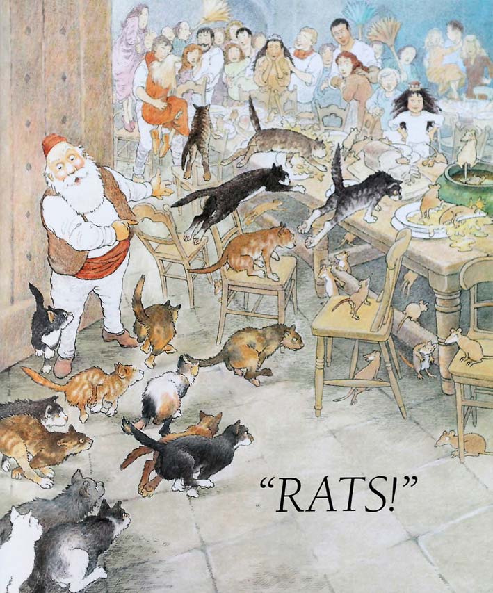 Los habitantes se sorprendieron enormemente al descubrir a esos curiosos y amables animales. Sin embargo, nada más sentarse los invitados a la mesa y empezar a servirse, una plaga de ratas apareció de golpe, invadiéndolo todo.