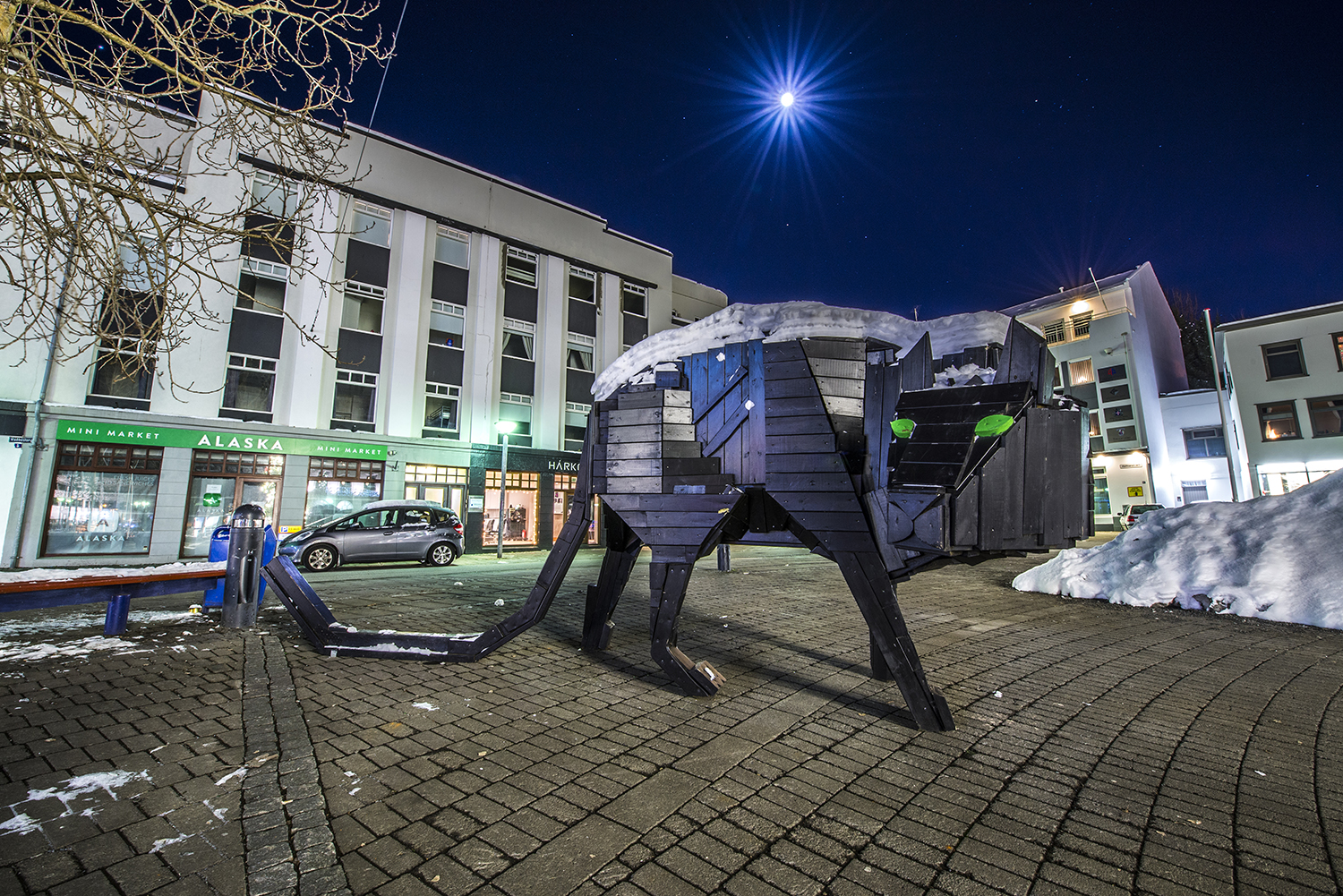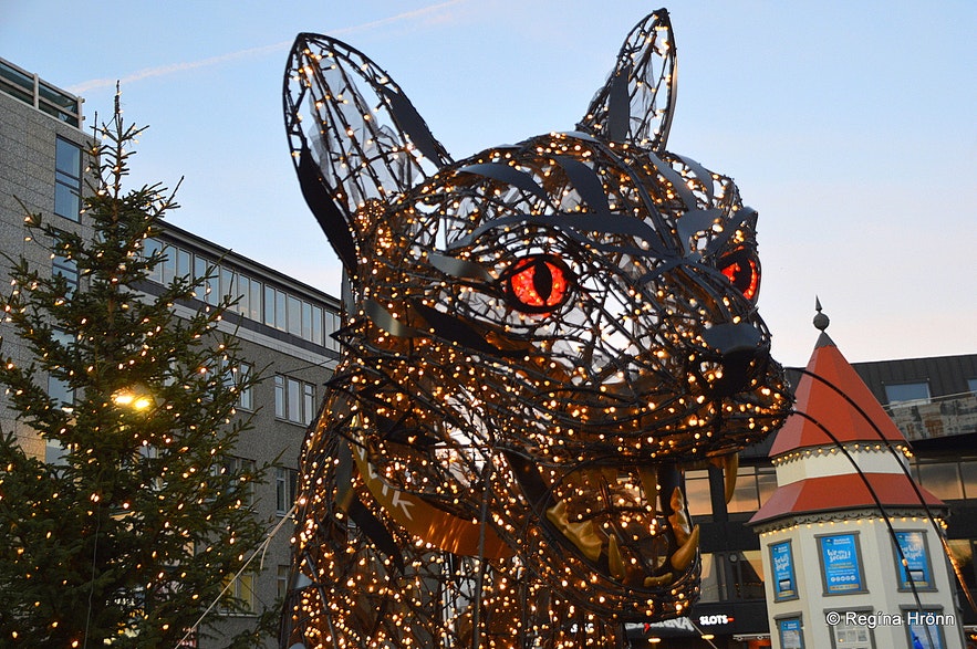 Ignoramos cómo acabó el debate, pero hemos descubierto otro gato de Navidad en la ciudad de Akureyri, totalmente al norte del país, en el fiordo Eyjafjörður. Parece estar hecho de metal, no de LED y, contrario a la tradición, tiene los ojos verdes. Los del verdadero Jólakötturinn son abrasadores y rojizos.
