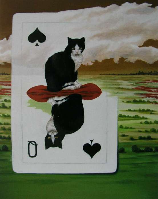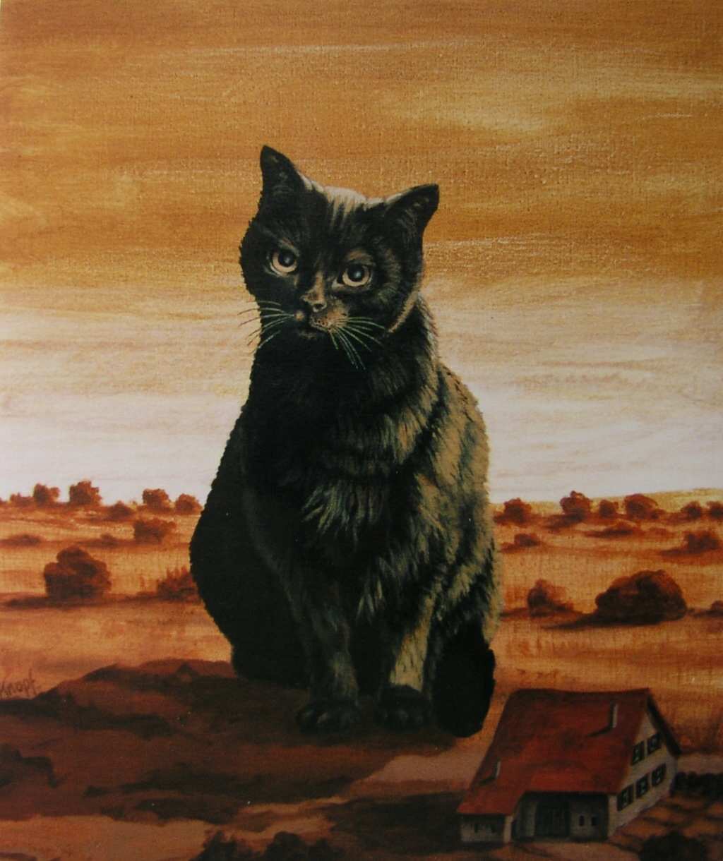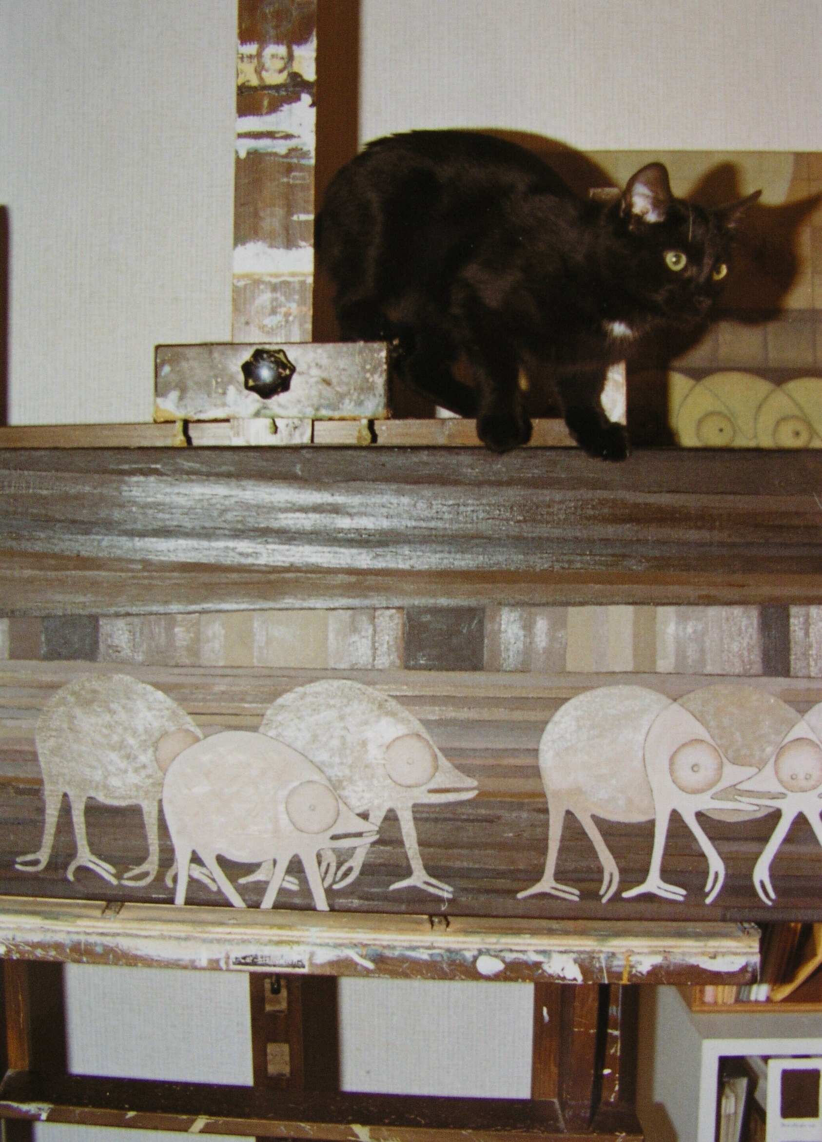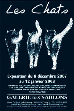 En el cartel de una exposición de 1995 vemos a un gato blanco y negro totalmente desproporcionado en comparación a la diminuta mujer que está a su lado. Esto nos hace pensar que los gatos empezaban a ser uno de los temas favoritos del pintor. A partir de entonces, los usa cada vez más a menudo como modelos.
