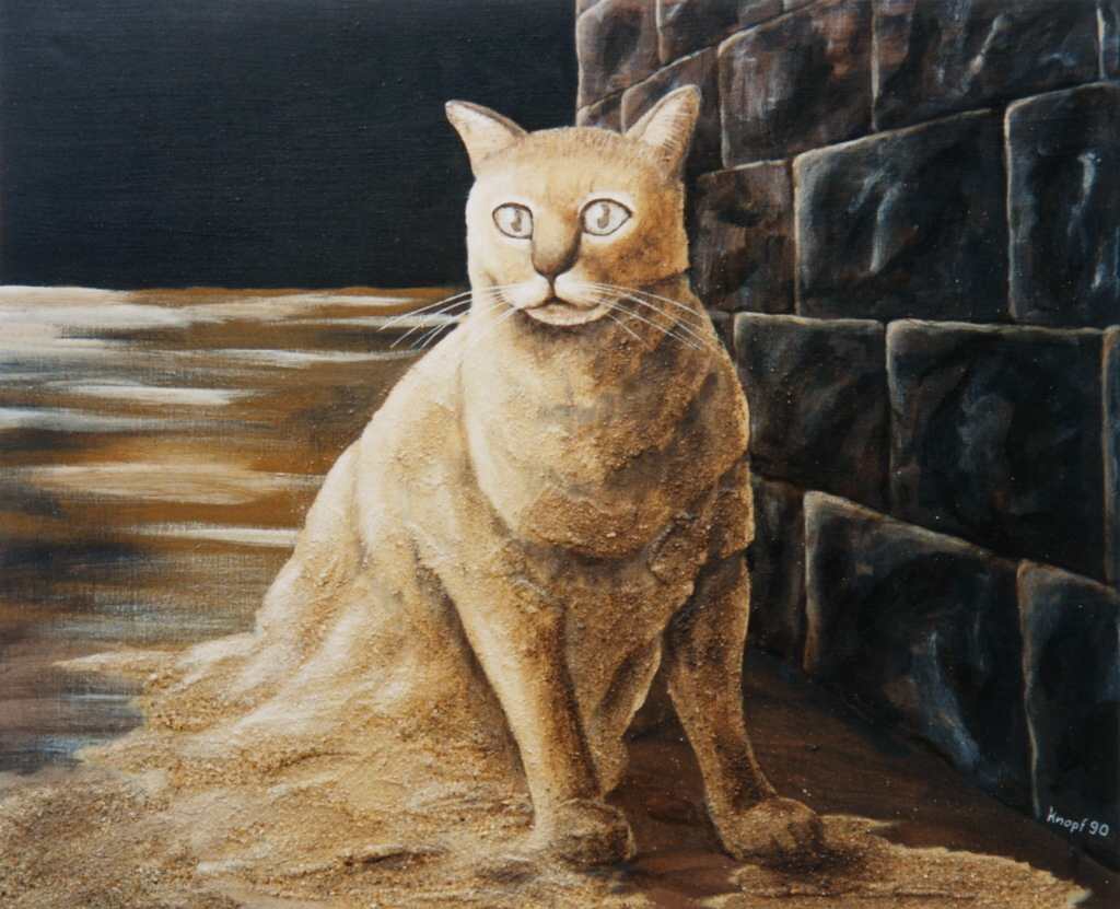 Em 1990 encontramos el primer gato: “Gato de arena”. También empieza a notarse un cierto alejamiento del surrealismo anterior. En los primeros años de la década de los 90, el cambio se hace mucho más patente y además de gatos aparecen otros animales, sobre todo bisontes.