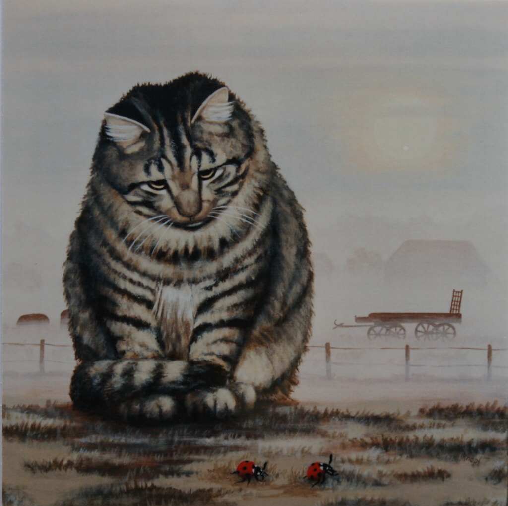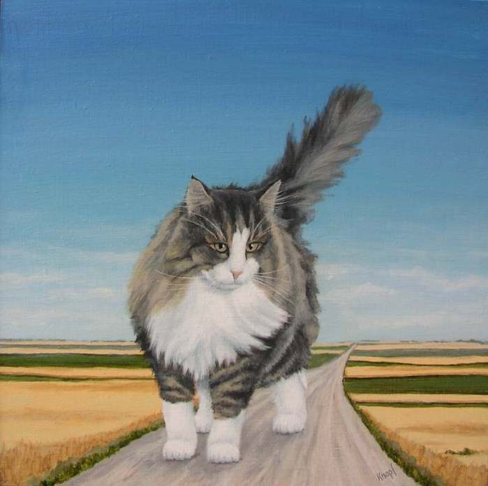 Pinta todo tipo de animales, entre los que abundan los gatos. Pero no se limita a reflejarlos en su entorno, sino en situaciones imposibles, desproporcionadas, inverosímiles, a menudo llenas de humor, sorprendentes y, en ocasiones, muy cerca de los sueños.