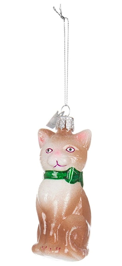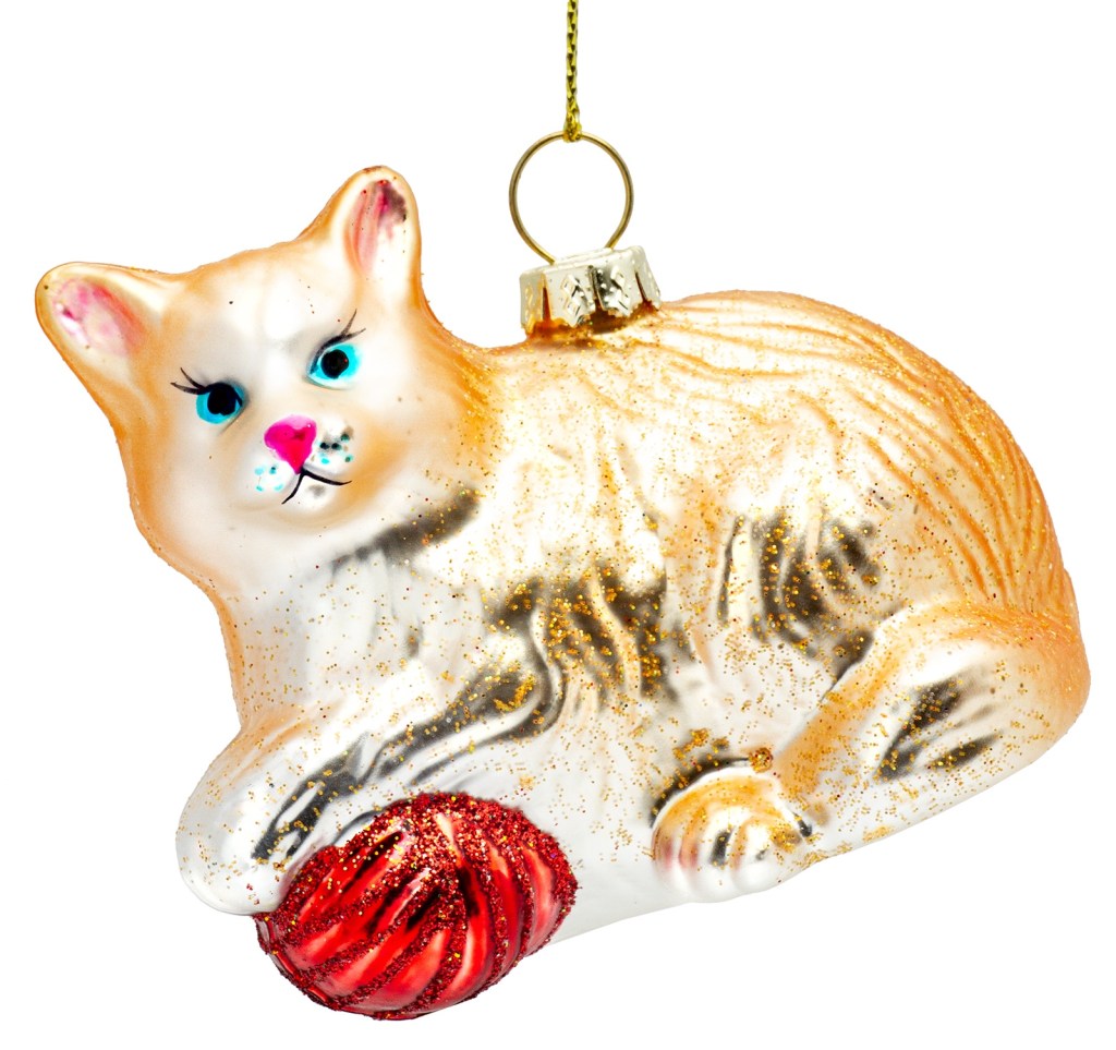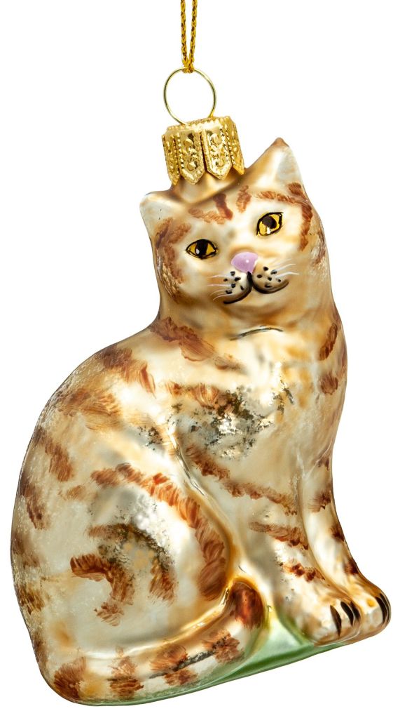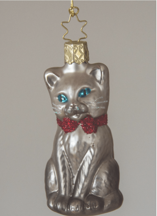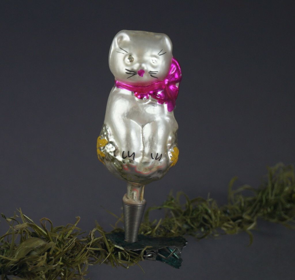 Entre tantas figuritas, no faltaban ni faltan los gatos. Actualmente, las fabricadas en Lauscha valen unos 7 euros cada una. Aún son de cristal soplado, moldeado y decorado a mano, y no aptas para hogares con gatos. Hemos encontrado una fechada en los años veinte vendida por 120 dólares en eBay. Las más antiguas (años veinte del pasado siglo) se colocaban en el árbol mediante un clip y la figurita estaba montada en un muelle.