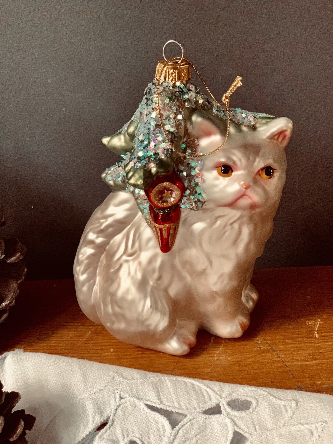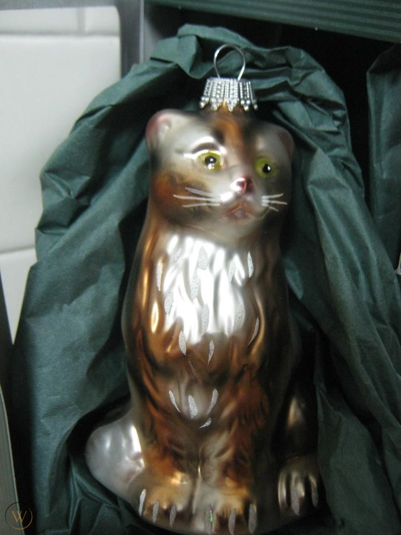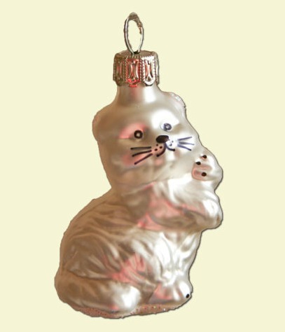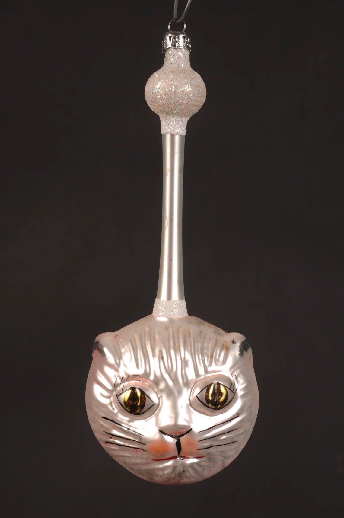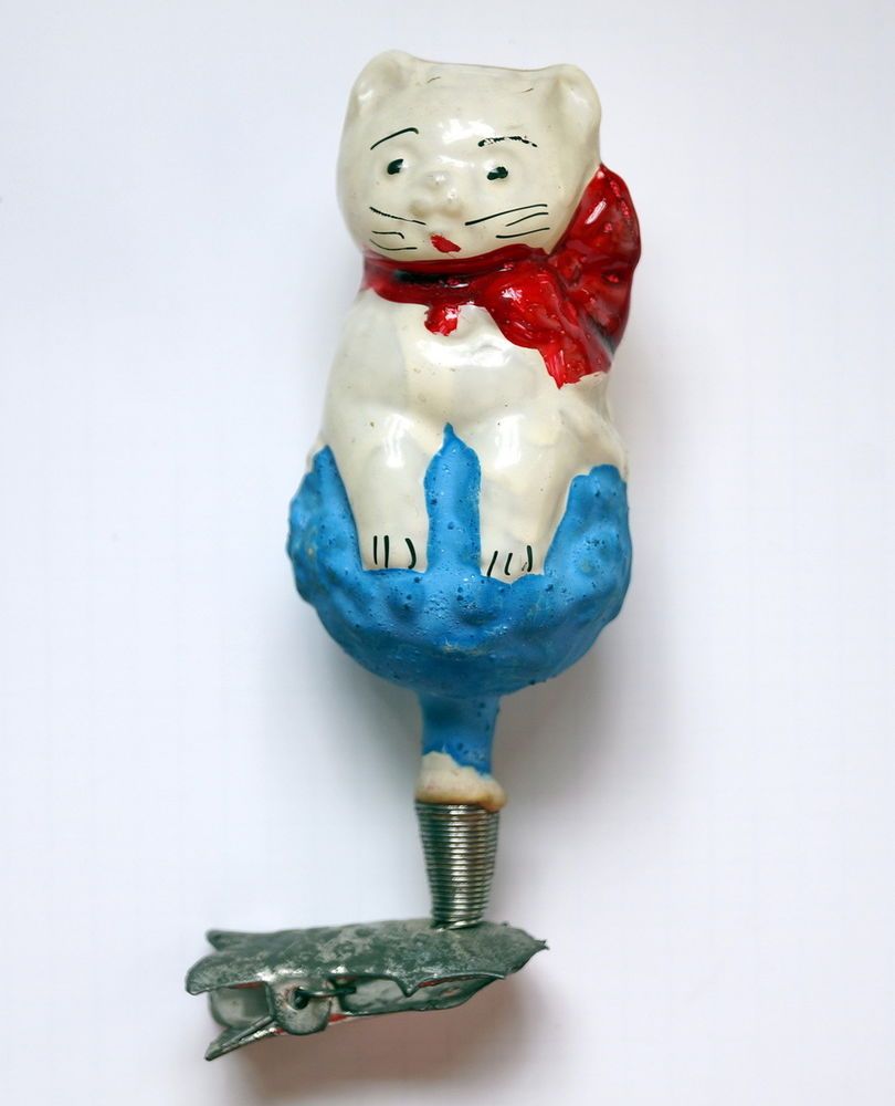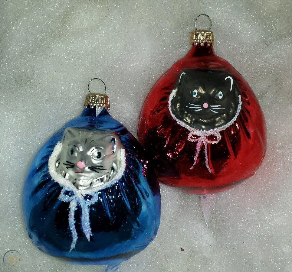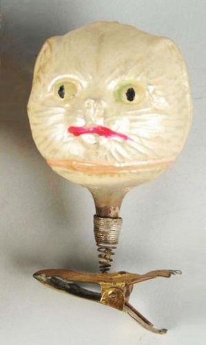 Entre tantas figuritas, no faltaban ni faltan los gatos. Actualmente, las fabricadas en Lauscha valen unos 7 euros cada una. Aún son de cristal soplado, moldeado y decorado a mano, y no aptas para hogares con gatos. Hemos encontrado una fechada en los años veinte vendida por 120 dólares en eBay. Las más antiguas (años veinte del pasado siglo) se colocaban en el árbol mediante un clip y la figurita estaba montada en un muelle.