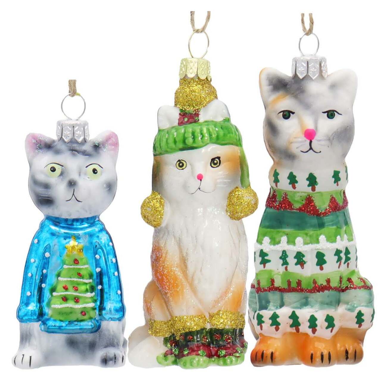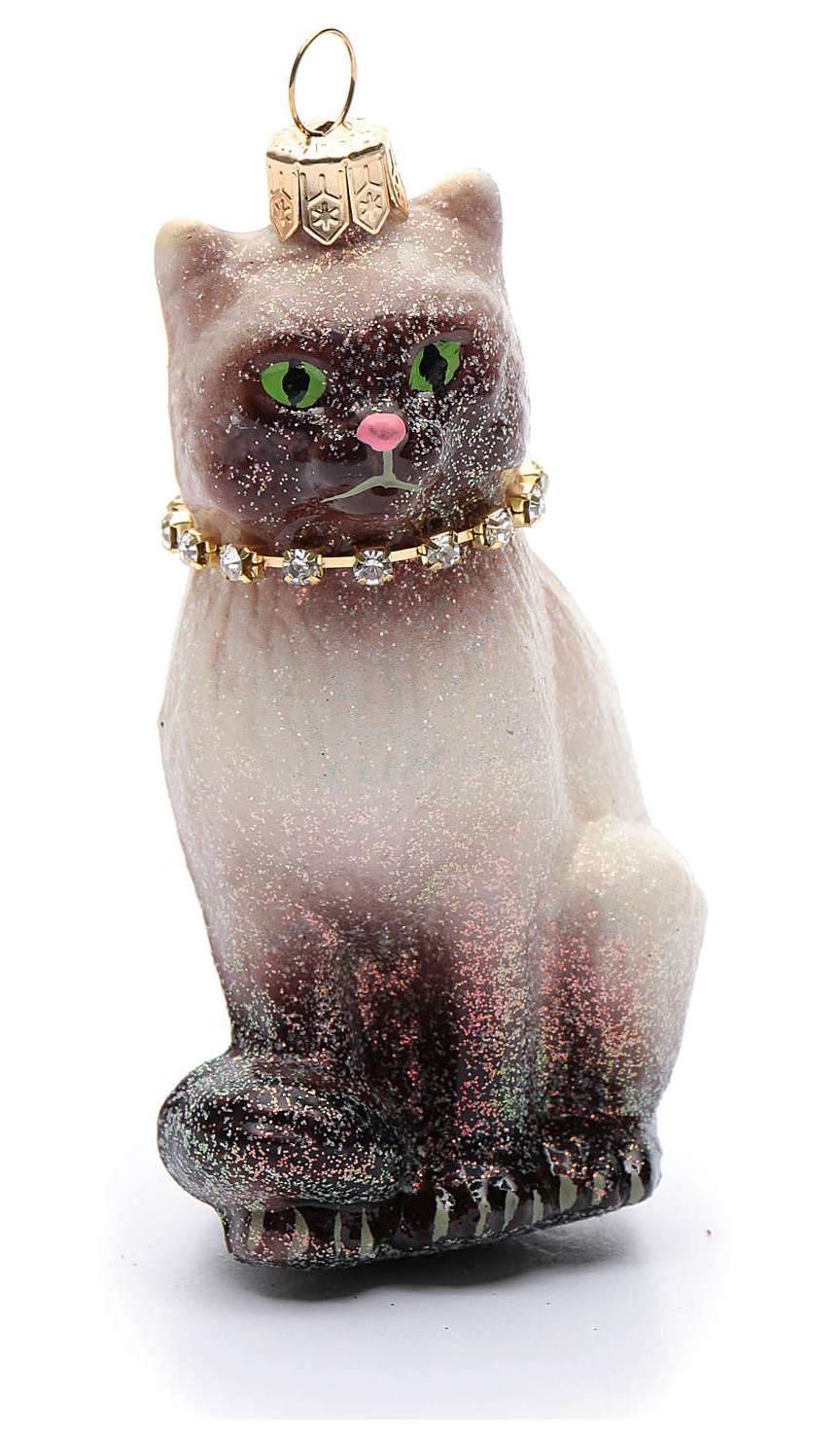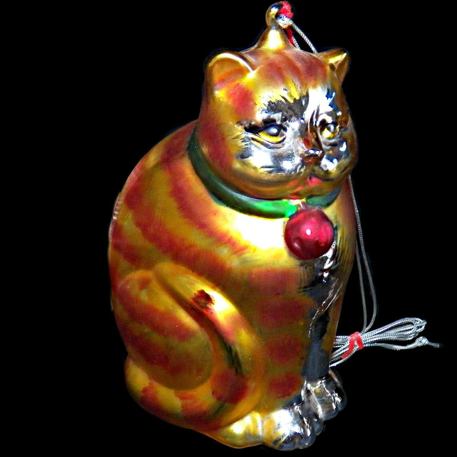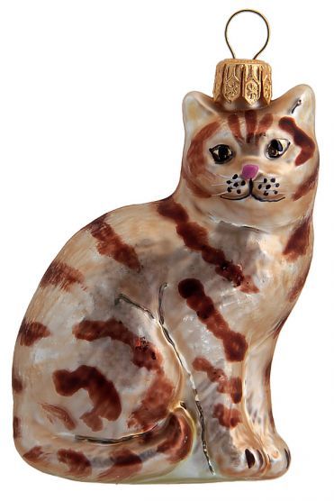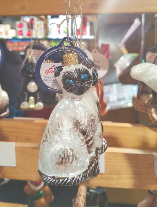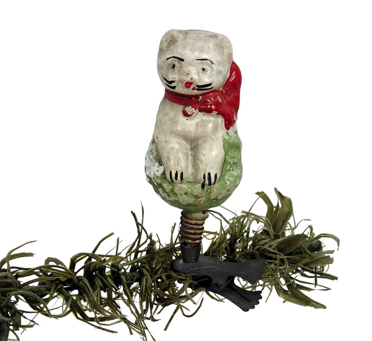 Entre tantas figuritas, no faltaban ni faltan los gatos. Actualmente, las fabricadas en Lauscha valen unos 7 euros cada una. Aún son de cristal soplado, moldeado y decorado a mano, y no aptas para hogares con gatos. Hemos encontrado una fechada en los años veinte vendida por 120 dólares en eBay. Las más antiguas (años veinte del pasado siglo) se colocaban en el árbol mediante un clip y la figurita estaba montada en un muelle.