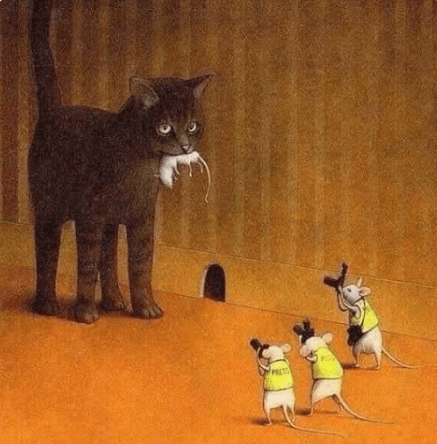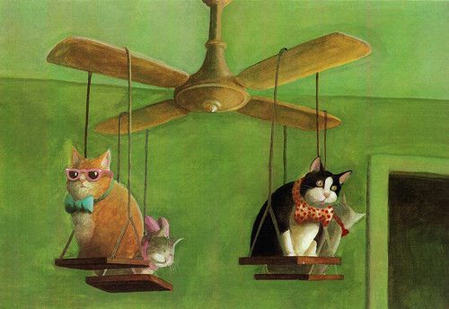 Existe un mundo donde los gatos vuelven a casa con la pata en cabestrillo, fuman con perros y polluelos, los cerdos nadan en platos de sopa o vuelan, los conejos llevan impermeable y hacen de las suyas, las gallinas de guinea se adornan con collares de perlas y las jirafas pasean en barco por tranquilos lagos.