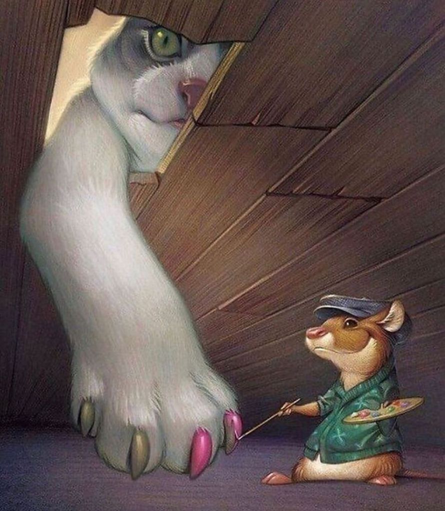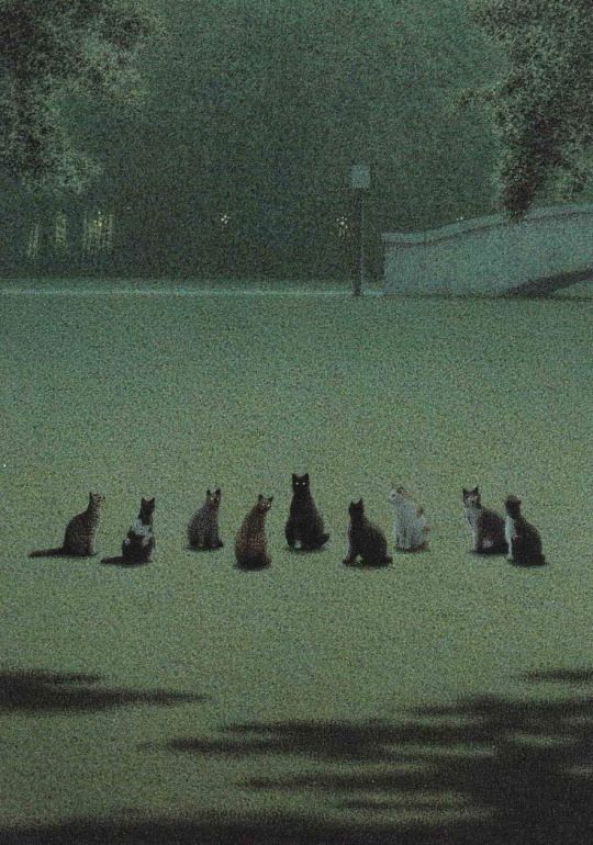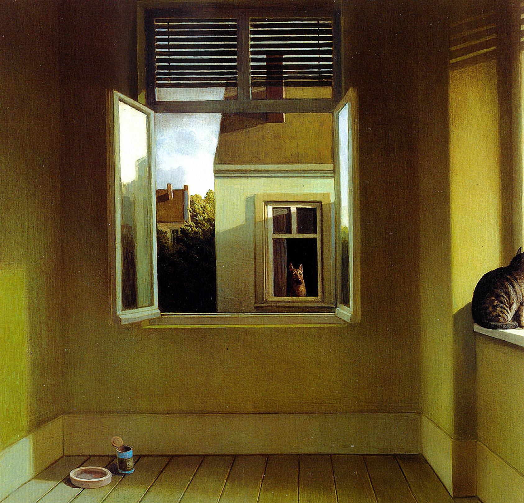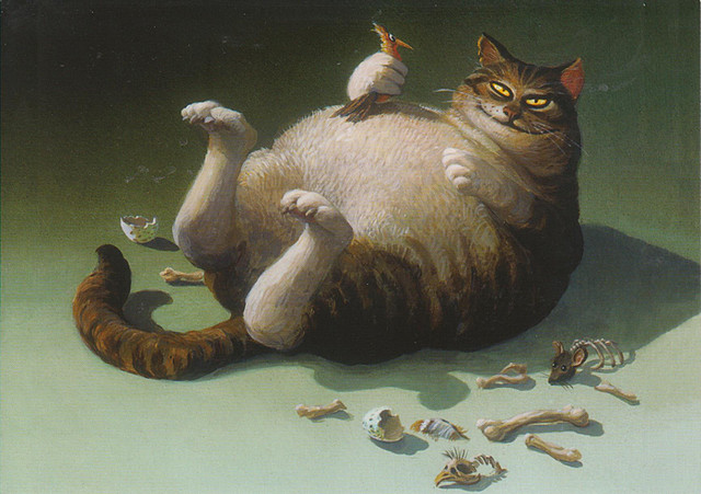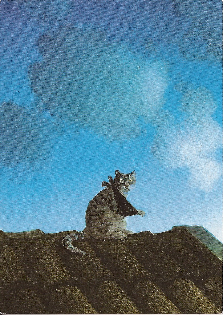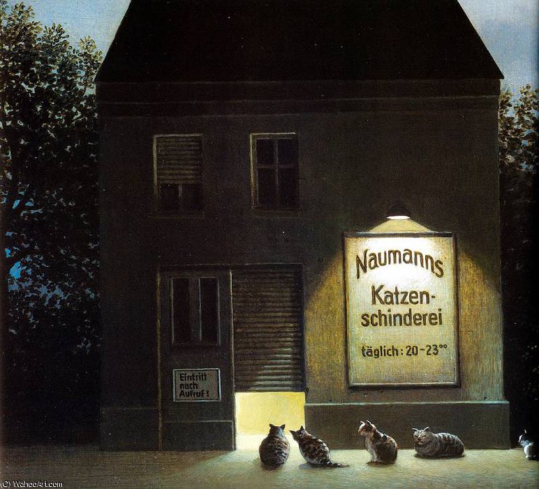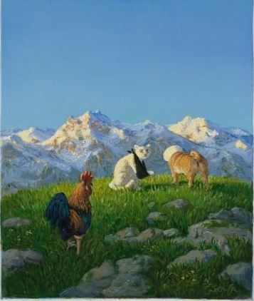 Entre los múltiples animales que pinta hay gatos, enormes conejos, osos que siguen a niñas como perros, perros amigos de gatos, aves de todo tipo, reales o no. Es posible que sus cuadros de gatos sean los más intranquilizantes, como “La tarea del gato”.