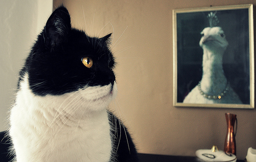Michael Sowa tiene un gato o, al menos, se hizo una fotografía con uno precioso – quizá sea gata – blanco y negro en lo que parece su taller.