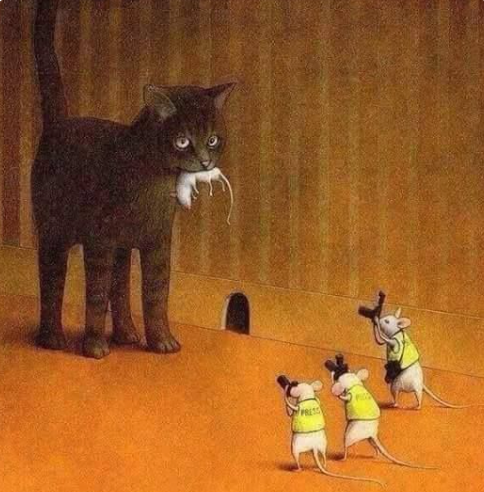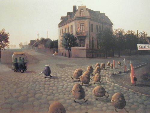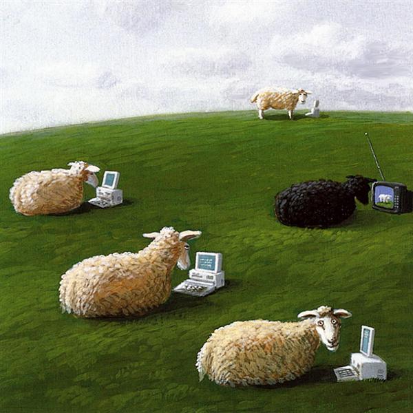 Para acabar, incluimos dos cuadros que no tienen nada que ver con gatos, pero nos parecen muy graciosos. Se trata de unas patatas andando con gran decisión por la calle y de cuatro ovejas blancas con ordenadores y una negra ante un televisor.