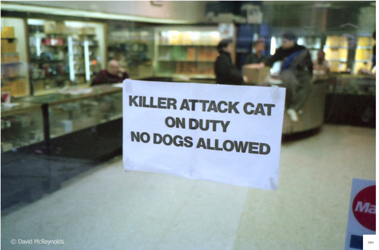 Acabamos esta entrada con la foto de un pequeño cartel hecha en 1991. Pegado a la vitrina de una tienda, reza: “Gato con instintos asesinos de guardia, prohibidos los perros”. Dedicamos esta entrada a todas las personas que creen en la paz.