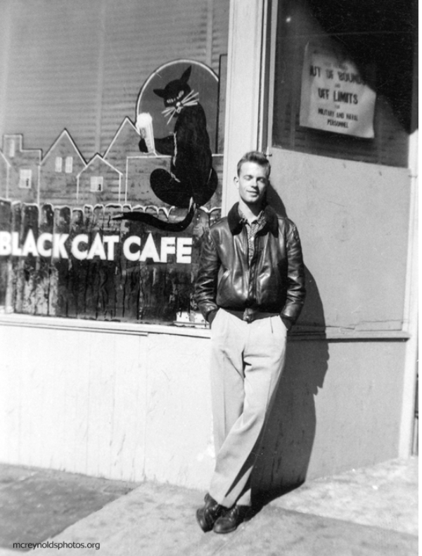 Convivió con gatos hasta el último momento de su vida. Mephistopheles, un hermoso gato blanco y negro, fue el primero, como demuestra esta foto realizada en el barrio de Ocean View, San Francisco, en 1954.