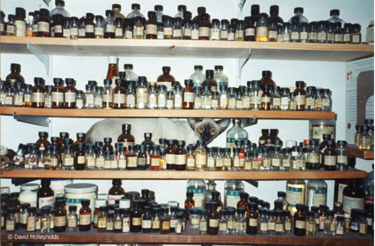 También fue miembro de la Bromeliad Society, un grupo botánico internacional dedicado al intercambio de semillas y esquejes. Llenó su piso del East Village con plantas exóticas y con estanterías cubiertas de diminutas botellas de perfume, ya que otra de sus pasiones era la creación de perfumes. Aquí vemos a Gandalf, uno de sus siameses, en una estantería abarrotada de frascos. Parece ser que Gandalf era capaz de subir y bajar sin tirar ninguno.