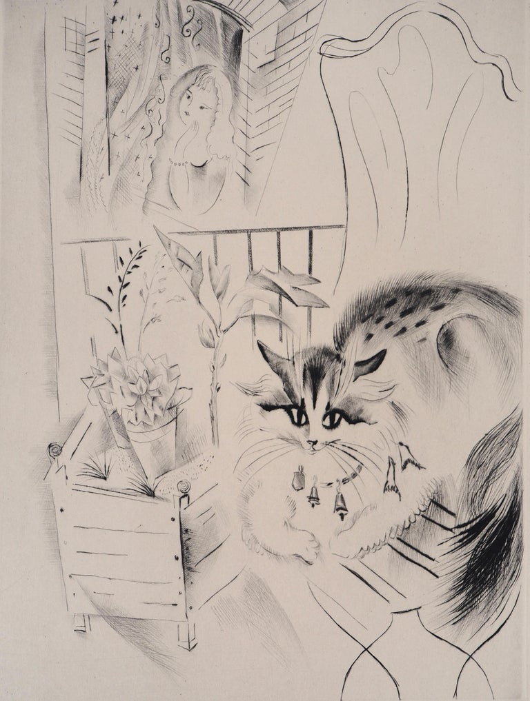 Una gata le sirvió de modelo para algunos grabados. En la foto, al lado de Mily, hay una gata persa que lleva un collar con colgantes… ¿de cascabeles? Y en varios grabados, también. Se ve claramente en el grabado en que está acostada al lado de un tiesto. Y sí, son cascabeles (algo que no recomendaríamos para un gato).