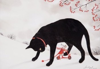 Otro libro suyo – este con un gato y una ardilla – se titula “Un amigo en invierno”. Cuenta la historia de Leo (según la traducción inglesa) o de Caramel (según la francesa), que se aburre y sueña con tener un amigo.