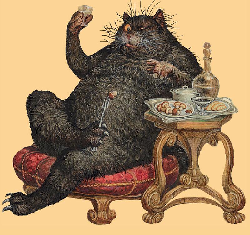 Pero volvamos a Behemot, un gato negro – supuestamente tan grande como un cerdo – que habla, anda sobre dos patas, puede adoptar forma humana, sabe jugar al ajedrez, le gusta beber vodka y comer bien, disfruta jugando con pistolas y tiene una fuerte tendencia a hacer comentarios de lo más desagradable.