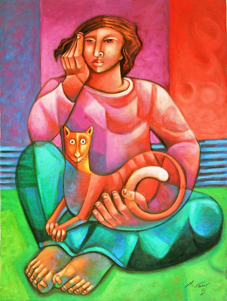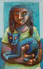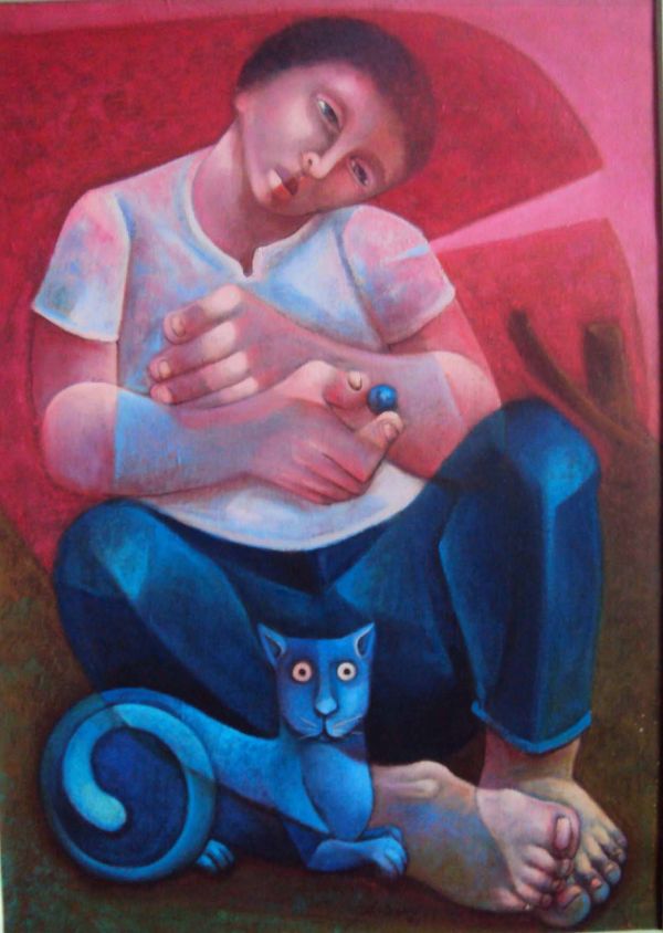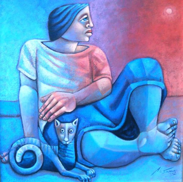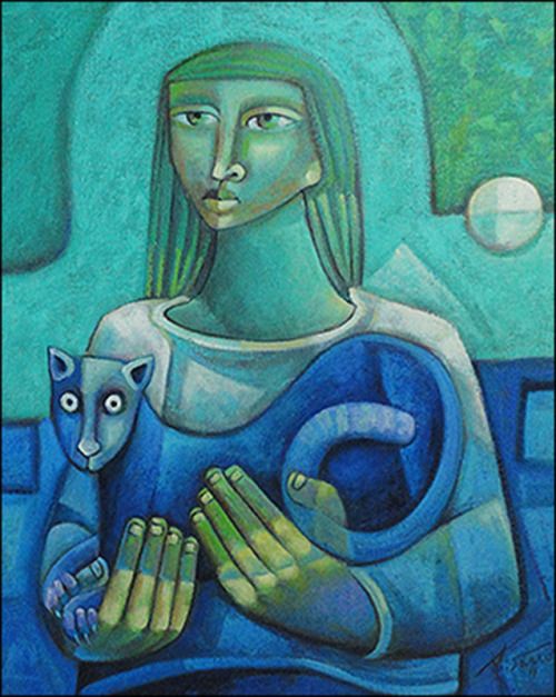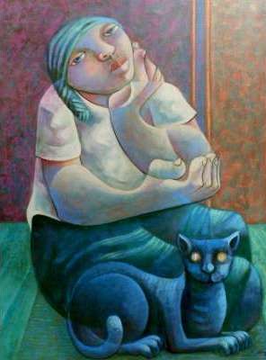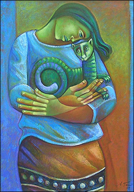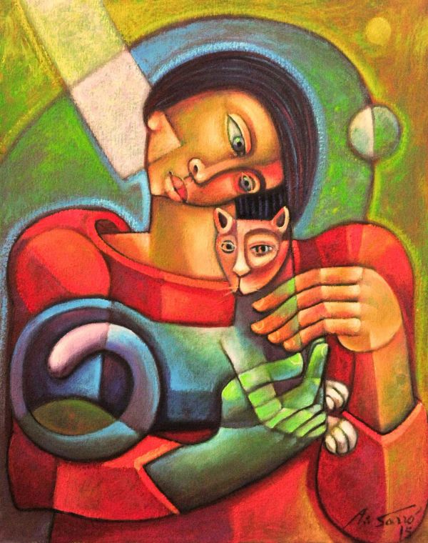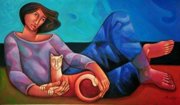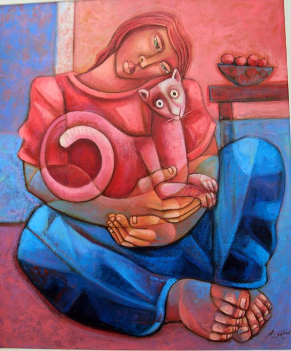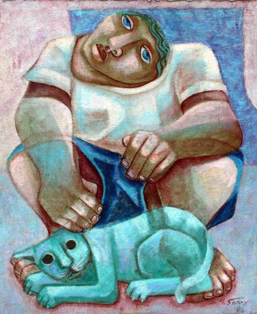 Viendo la obra del pintor, nos llamó la atención que la mayoría de los animales vivos que incluía en sus composiciones fueran gatos. Hay aves – pero son mucho más simbólicas –, algún que otro perro y poco más. Los peces aparecen en bandejas, para ser vendidos. Se centra en mujeres y hombres solos, en pareja o pequeños grupos, y de vez en cuando – su obra es muy amplía – con un gato.