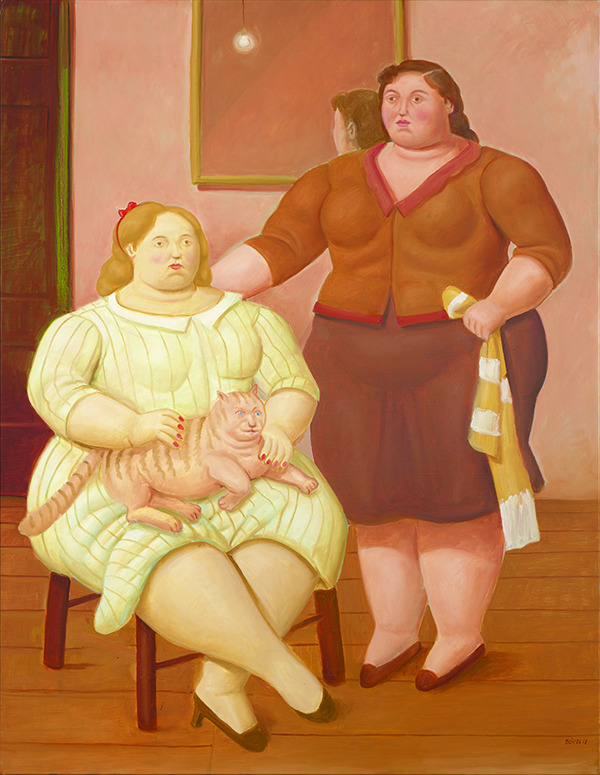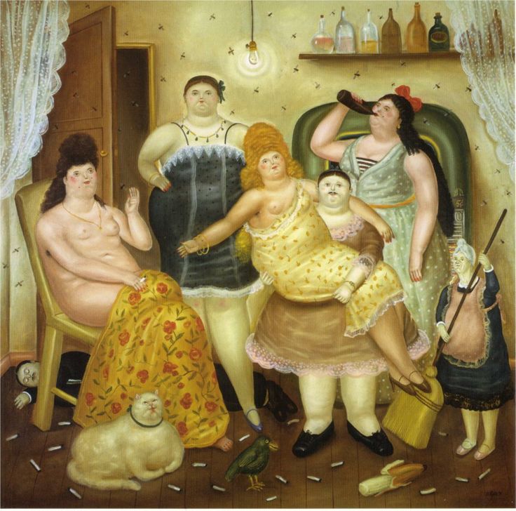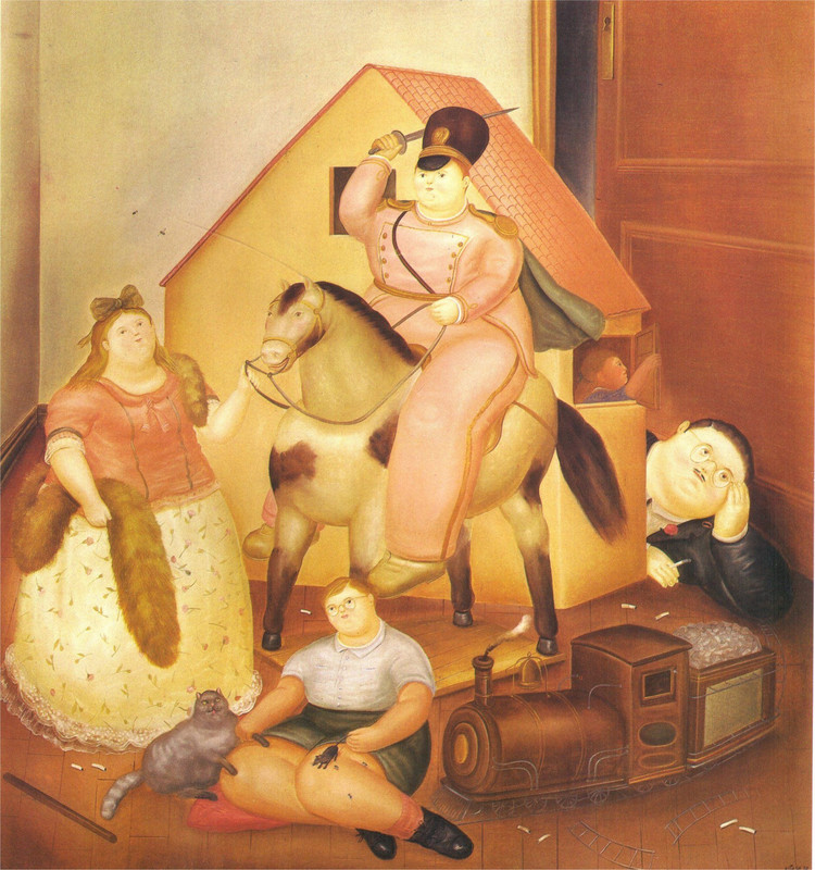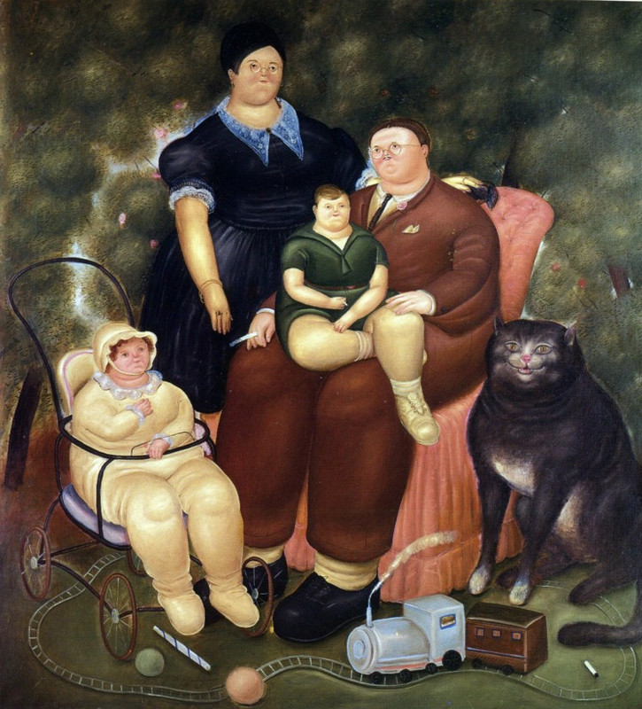 En “La familia colombiana” (1973), un cuadro muy curioso por cierto, el padre sujeta a un gato atigrado en el regazo, mientras que la madre, de pie detrás de él, lanza una mirada asesina a la criada que les trae una bandeja con café. Ahora bien, ¿por qué hay un adolescente desnudo dormido en el sofá?