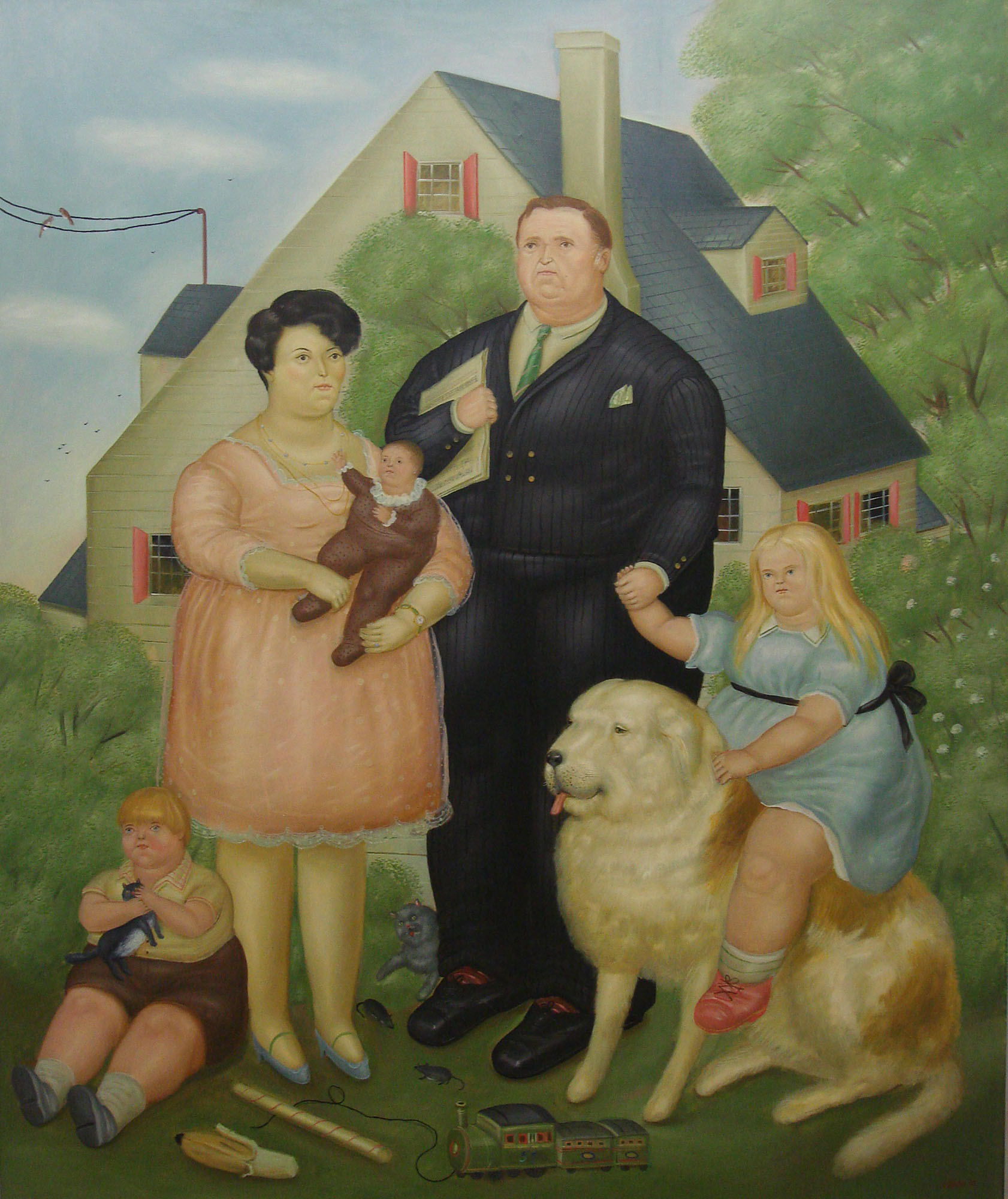 Pero en otro cuadro de 1970, el gato en brazos del niño es minúsculo. Esta familia no tiene nada de colombiana, es el vivo retrato de la perfecta familia nuclear estadounidense: padre, madre, dos hijos, una hija, perro y… dos gatos, todos posando delante de la perfecta casa con jardín.