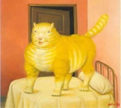 También de esa época, concretamente de 1994, es el cuadro de un enorme gato rubio de pie en una cama en la que casi no cabe.