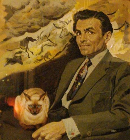 Acabaremos con un curioso retrato del actor. Según lo que hemos podido descubrir está o estaba colgado en un pub de Charing Cross, Londres. No tenemos ni idea de si esto es verdad. Es curioso, desde luego, aunque no muy bueno. Se ve a Mason sentado en un sillón con un siamés en el regazo delante de un friso de dibujos prehistóricos. Sorprendente. ¿Un sillón en una cueva prehistórica?