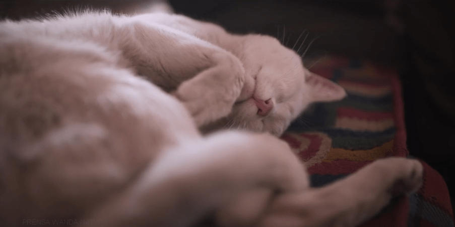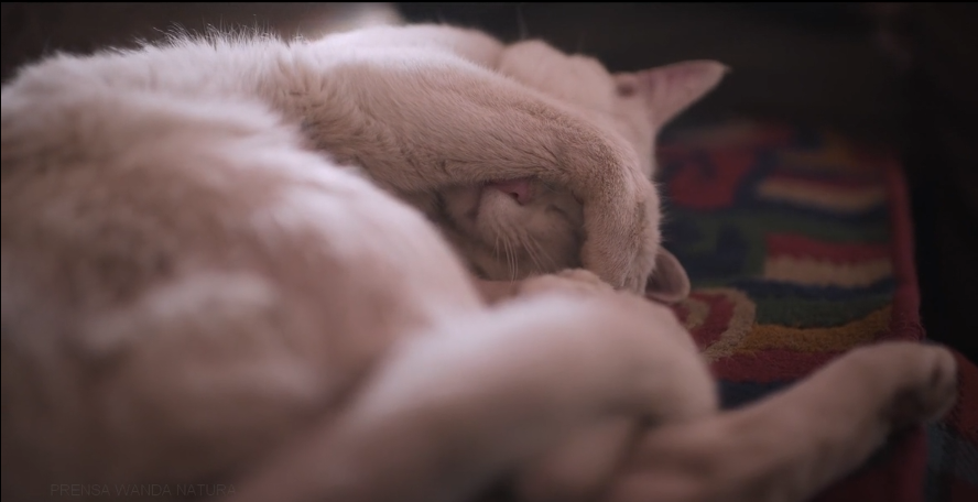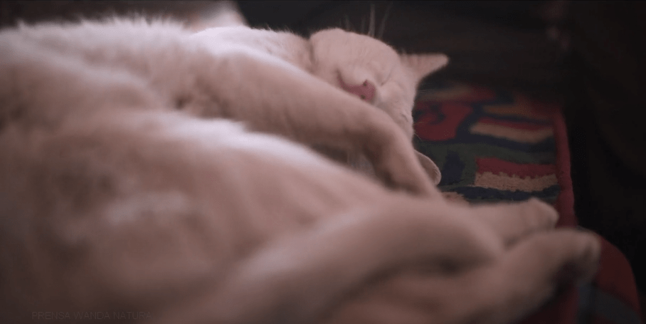 Pero cuál no fue nuestra sorpresa cuando, ya en la parte final del documental, descubrimos a un gato doméstico en la cabaña de unos pastores nómadas. Se trata de un precioso gato rubio claro durmiendo a sus anchas en una mesa mientras la familia y los visitantes hablan y se mueven.