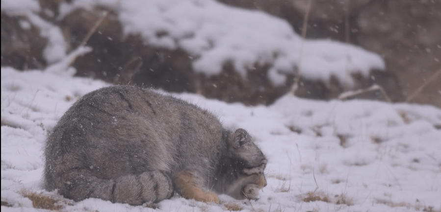 El gato de Pallas o manul (Felis u Otocolobus manul), al que dedicamos una entrada hace cuatro años y en la que incluimos una fotografía de Vincent Munier, por cierto (https://gatosyrespeto.org/2018/08/02/el-gato-pallas-o-felis-manul/), aparece en varias ocasiones en el documental. Dos de las fotografías que incluimos (cabeza de manul y manul en la nieve) son fotografías suyas, las otras son capturas de pantalla del documental.