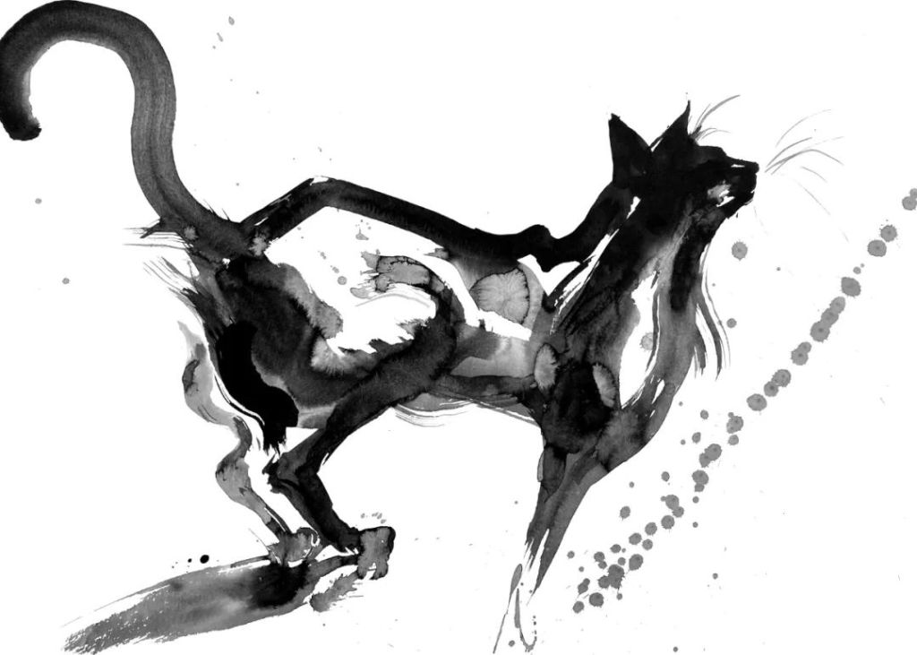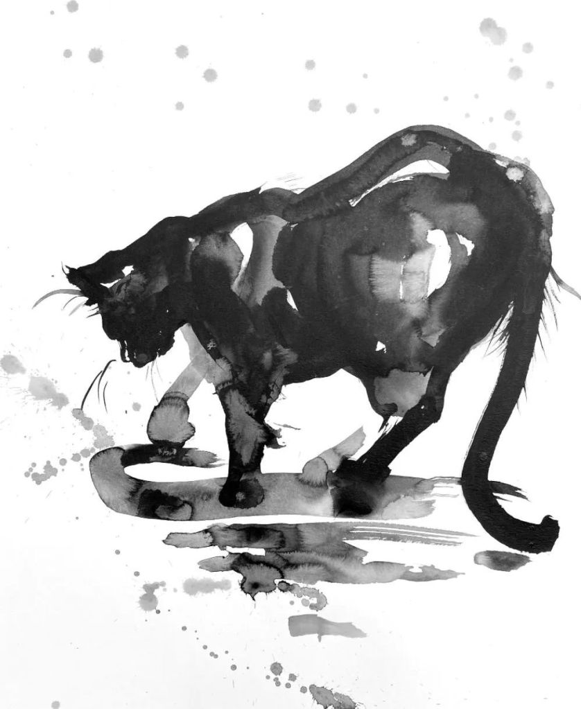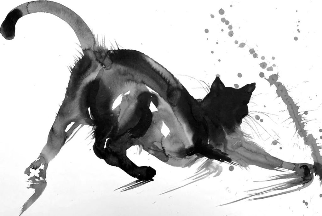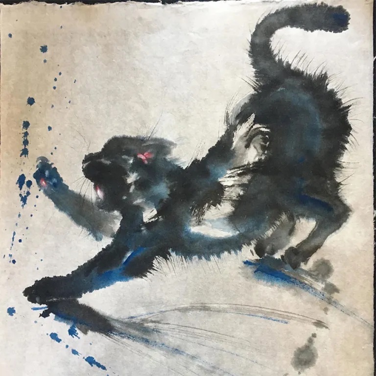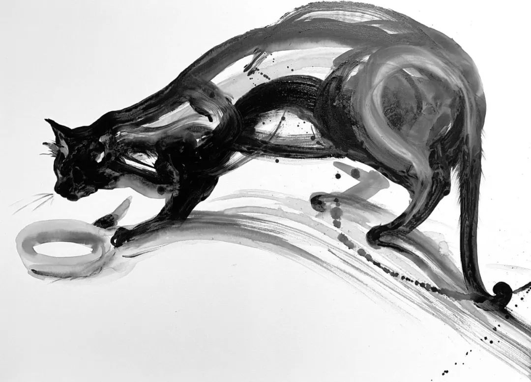 Esa serie se llamó “Jumping Kittens” (Gatitos saltando) y no tardó en transformarse en el libro “Ink Kittens” (Gatitos de tinta), publicado el 21 de agosto de 2020 con 38 dibujos de gatos en diversas posiciones realizados con unas cuantas pinceladas. “Solo utilicé tinta negra para sumi-e (una técnica de dibujo monocromático) y dos pinceles de caligrafía para reproducir a mi amigo Tux. Tengo la impresión de que un gato aporta energía a mis proyectos, movimiento a mi pincel, y tranquilidad a mi vida”.