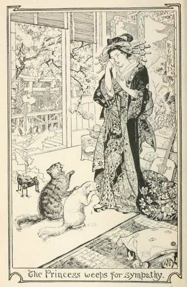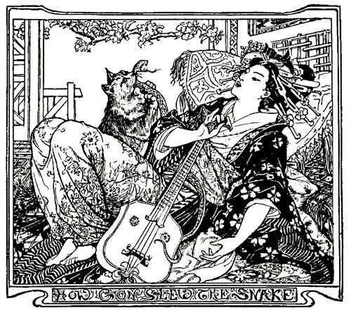 Un día, mientras la princesa tocaba su instrumento favorito, sintió algo deslizándose por los pliegues de su precioso kimono y vio que su enemigo estaba a punto de besarla. Gritó al tiempo que se echaba hacia atrás. Gon, que dormía a sus pies, se despertó, entendió la intención de la serpiente y se tiró sobre ella, agarrándola por el cuello.