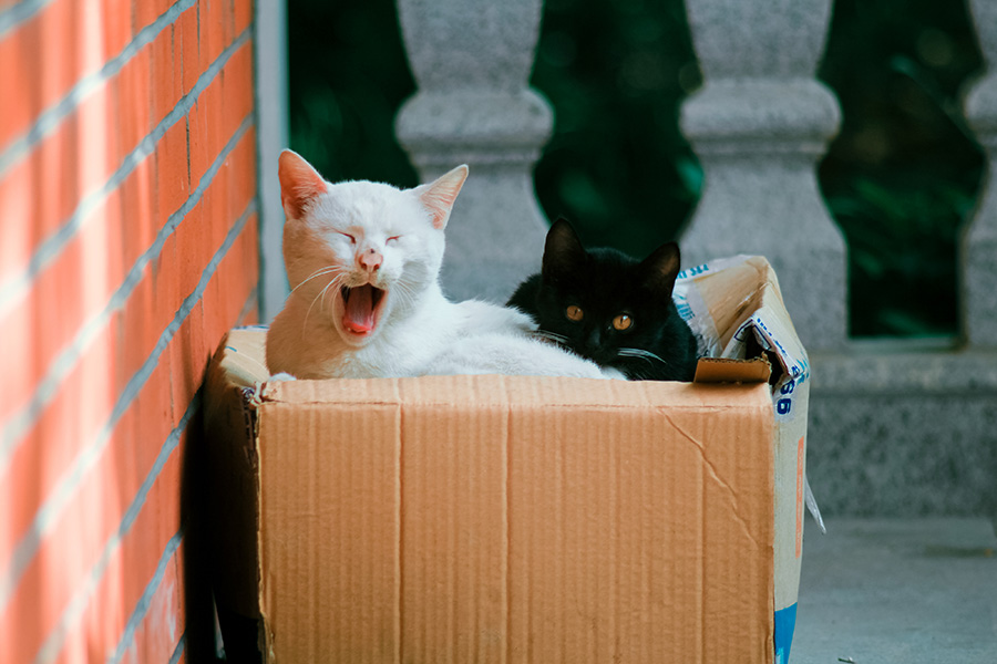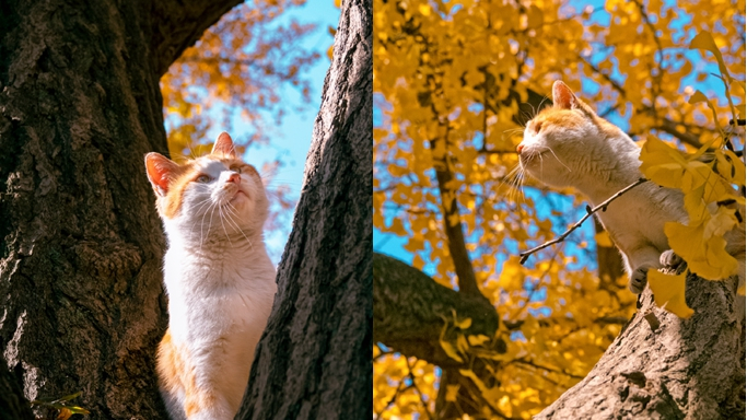 Los gatos de Wu Hongli no siempre están limpios porque la mayoría son callejeros que deben buscarse la vida y, a veces, comer es más importante que acicalarse. En muchas ocasiones, el fotógrafo sitúa a los protagonistas en un paisaje, dejándonos adivinar dónde están, como los dos gatos blancos y negros de la Ciudad Prohibida.
