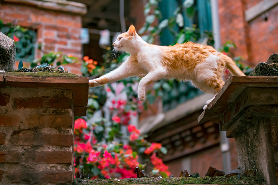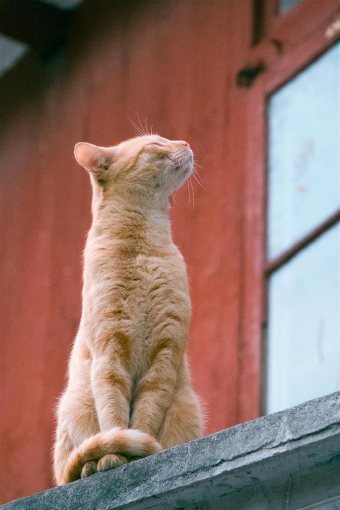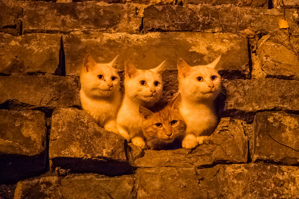 El trabajo de Wu Hongli implica mucha paciencia y recorrer kilómetros andando. Una de sus fotos más famosas fue hecha en noviembre de 2017 en Nankín, en la provincia de Jiangsu, al este de China. Ese día seguía la muralla de Nankín, construida por la dinastía Ming, pero hasta el atardecer no le sonrió la suerte. Un poco más adelante vio cuatro cabezas asomar por un agujero en la muralla: tres gatos blancos y un anaranjado. Se arrodilló y los fotografió iluminados por los rayos del sol a punto de desaparecer.